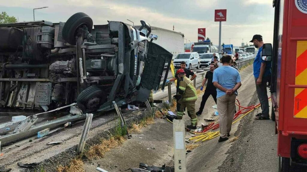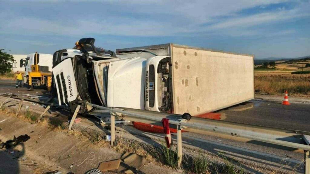 Edinilen bilgiye göre kaza, üzerinde , Mustafakemalpaşa ilçesi Güllüce Mahallesi mevkiinde meydana geldi. Bursa istikametinden Balıkesir yönüne doğru seyir halinde olan domates püresi yüklü kamyon, henüz bilinmeyen bir nedenle sürücüsünün direksiyon hakimiyetini kaybetmesi sonucu refüjü aşarak karşı şeride geçti. Karşı şeride geçen kamyon, yan yatarak durabildi. Kazada kamyon sürücüsü Y.E., aracın kabininde sıkıştı.