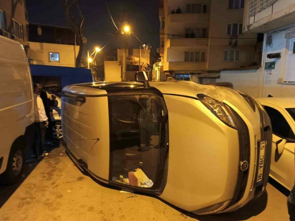 Bursa’nın Osmangazi ilçesinde hafif ticari araç sürücüsünün direksiyon hakimiyetini kaybetmesi sonucu park halindeki otomobile çarpıp yan döndü.