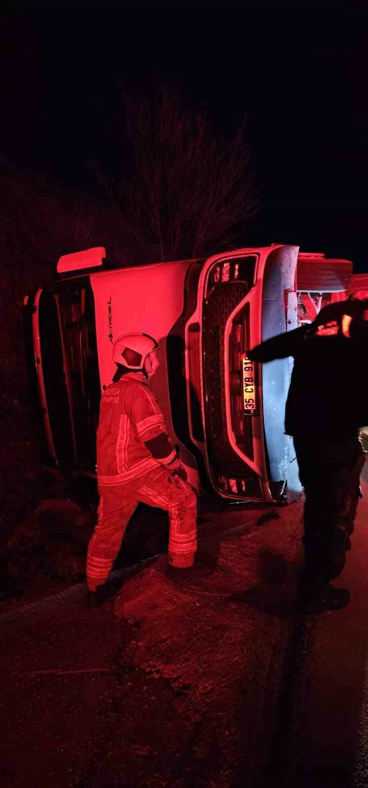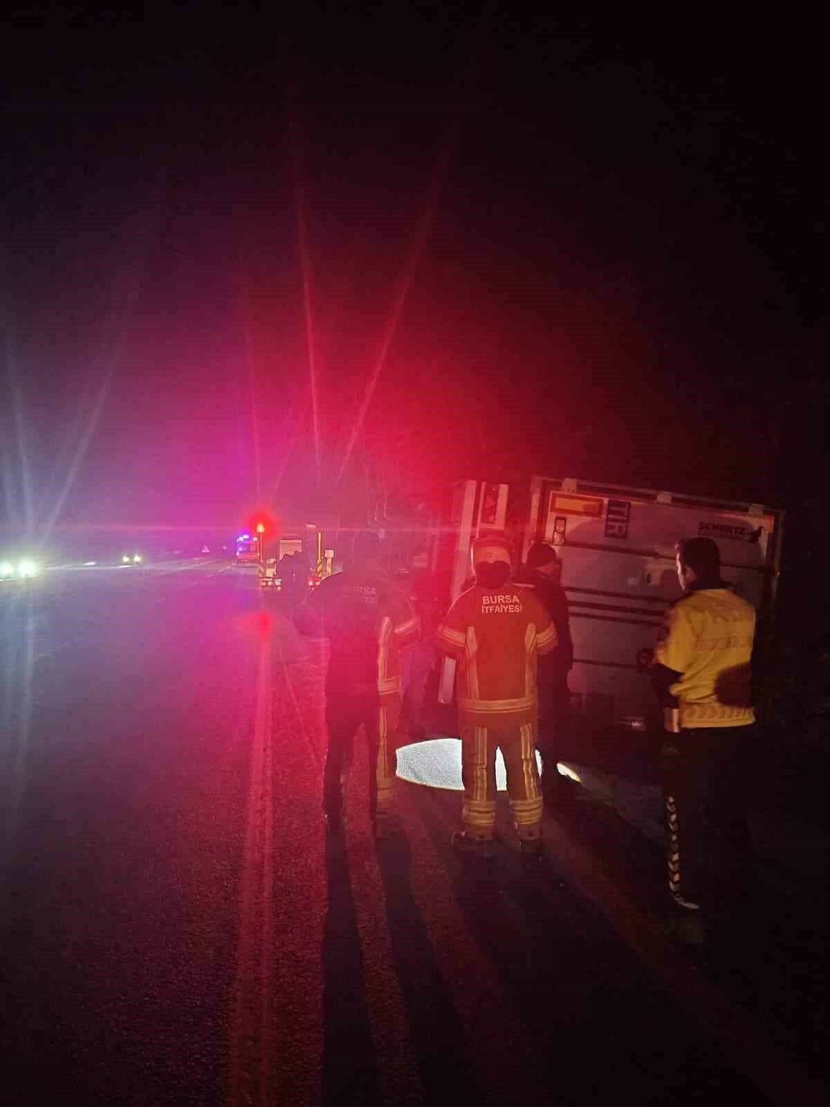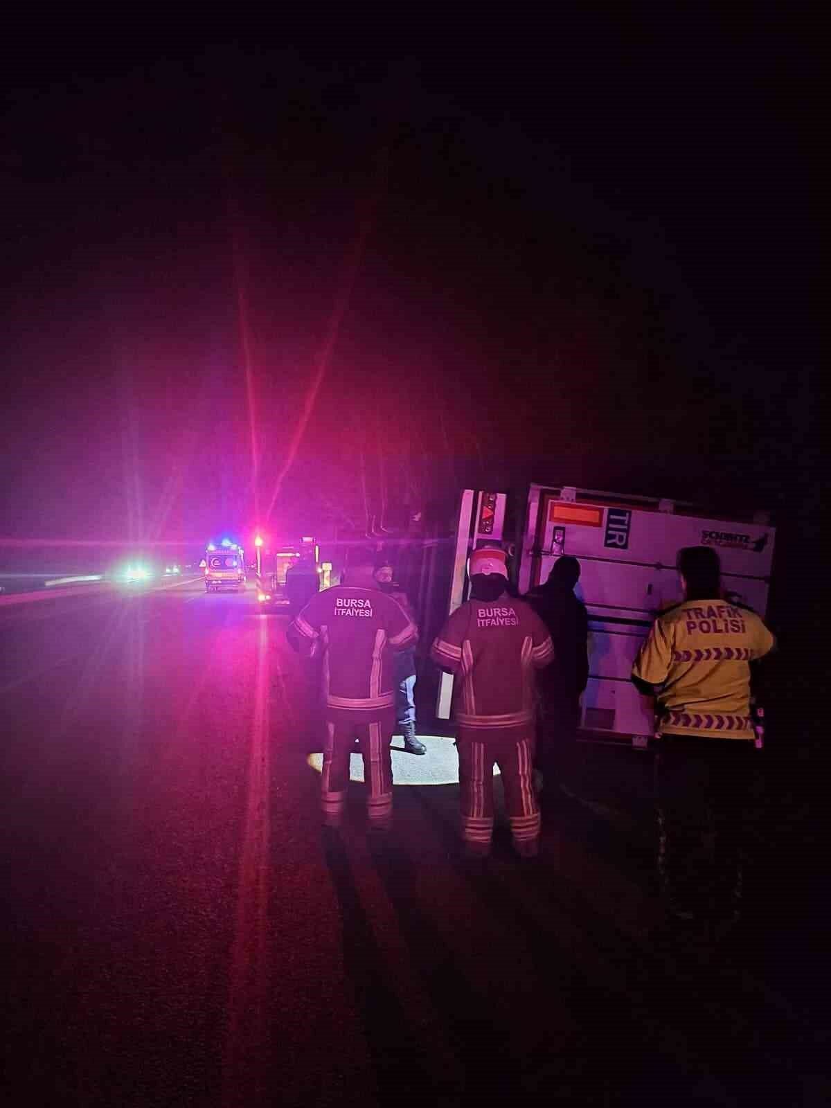Kaza saat 05.30 sıralarında Bursa-Ankara karayolu üzeri İnegöl’ün Mezit-5 mevkiinde meydana geldi. Bozüyük istikametinden İnegöl’e seyir halinde olan Sürücü Saffet S.(33) yönetimindeki 35 CYB 918 plakalı patates yüklü TIR, sürücüsünün kontrolünden çıkarak yolun kenarına devrildi. Kaza yerine 112 jandarma ve itfaiye arama kurtarma ekipleri sevk edildi. Ekipler kabinde mahsur kalan sürücüyü kurtardılar. Kazayı burnu bile kanamadan atlatan şoför, hastaneyi gitmeyi reddedince Ambulansta tedavi edildi.