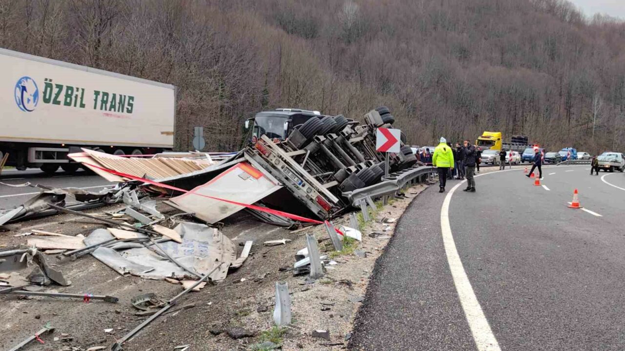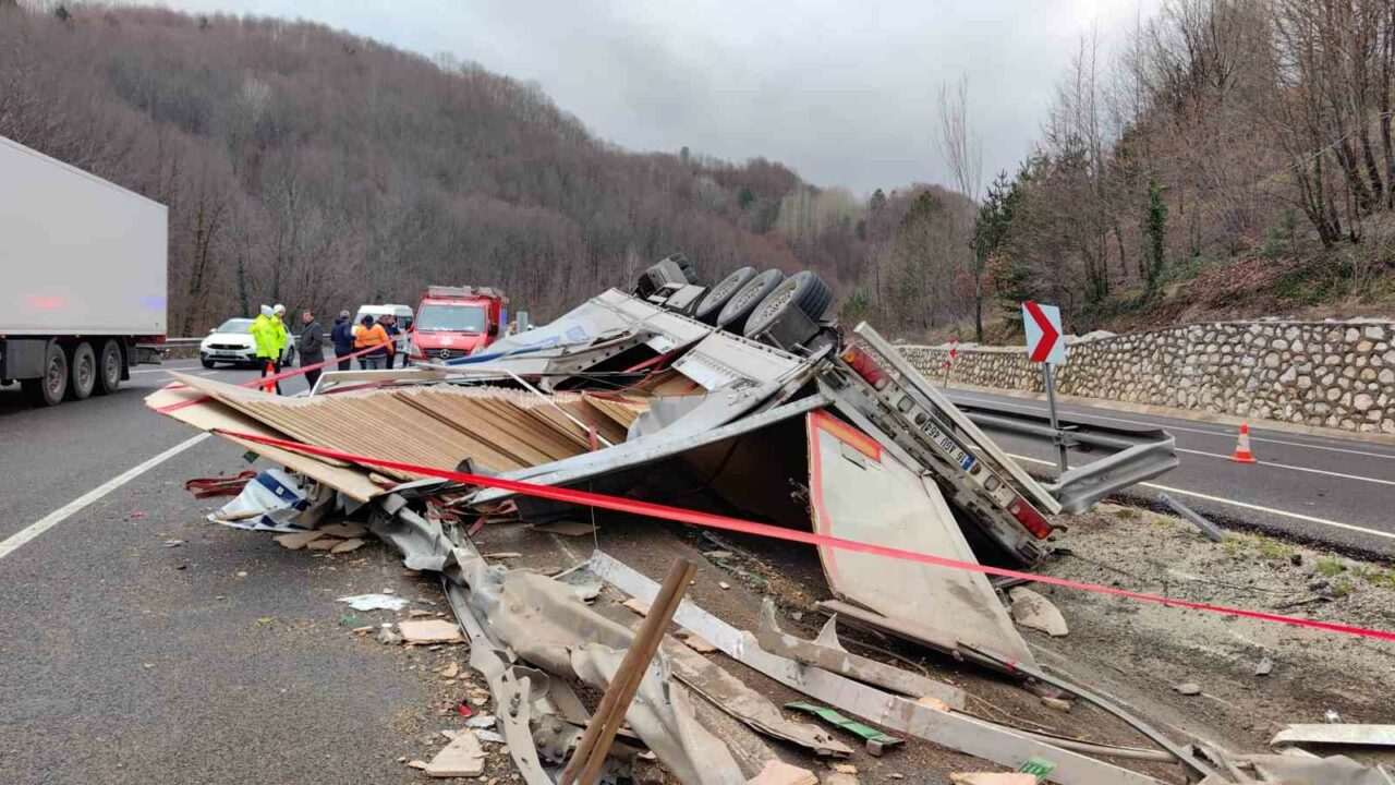 Eskişehir’den yüklediği suntaları İnegöl’e getirmek üzere yola çıkan Ömer Doğan (59) yönetimindeki 16 PK 936 plakalı tır, virajda sürücünün kontrolünden çıkarak refüje devrildi.