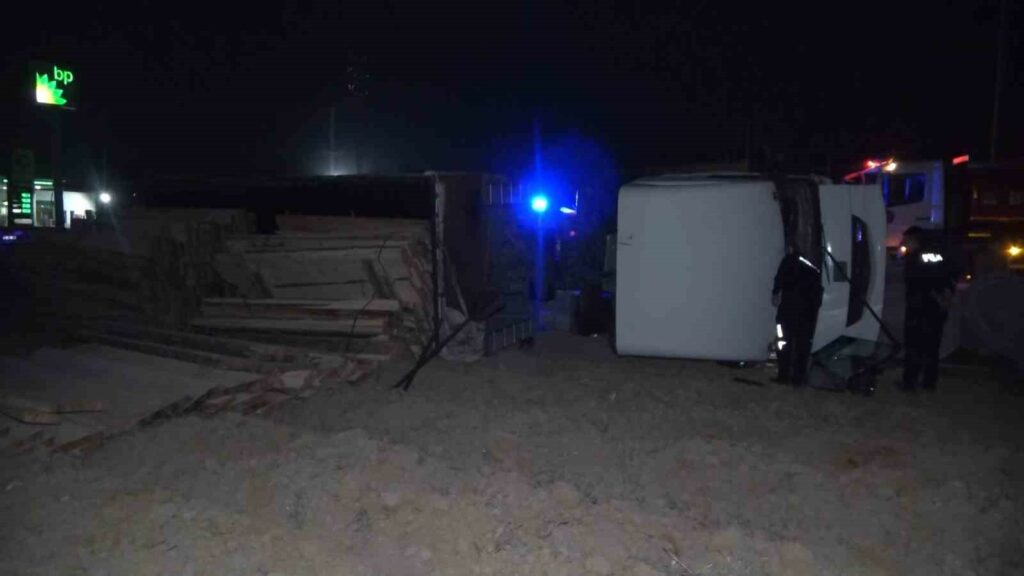 Çarpmanın etkisiyle kontrolden çıkan kereste yüklü tır, yol kenarındaki tarlaya uçarak yan yattı. Şoför, yan yatan tırdan çıkarak kaçtı.
