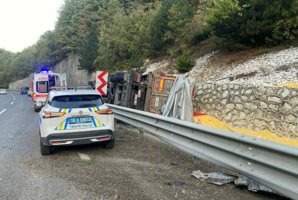 Bursa’nın İnegöl ilçesinde kontrolden çıkan yem yüklü TIR devrildi, sürücü ve eşi yaralandı.