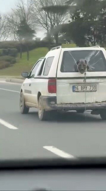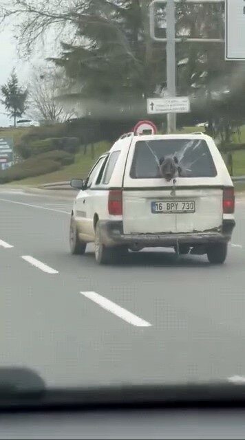 İlginç anlar, Bursa-Ankara karayolu üzeri İnegöl girişinde kayda alındı. Sürücüsünün ismi öğrenilemeyen kamyonetin arka camının kırık olduğu görüldü. Camdan başını dışarı çıkaran köpek, trafikteki diğer sürücülerin dikkatini çekti. Köpeğin rahat tavırları ve etrafı meraklı gözlerle izlemesi görenleri gülümsetti.