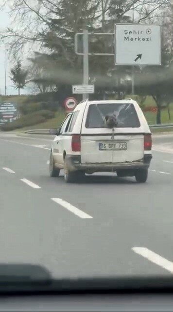 İlginç anlar, Bursa-Ankara karayolu üzeri İnegöl girişinde kayda alındı. Sürücüsünün ismi öğrenilemeyen kamyonetin arka camının kırık olduğu görüldü. Camdan başını dışarı çıkaran köpek, trafikteki diğer sürücülerin dikkatini çekti. Köpeğin rahat tavırları ve etrafı meraklı gözlerle izlemesi görenleri gülümsetti.