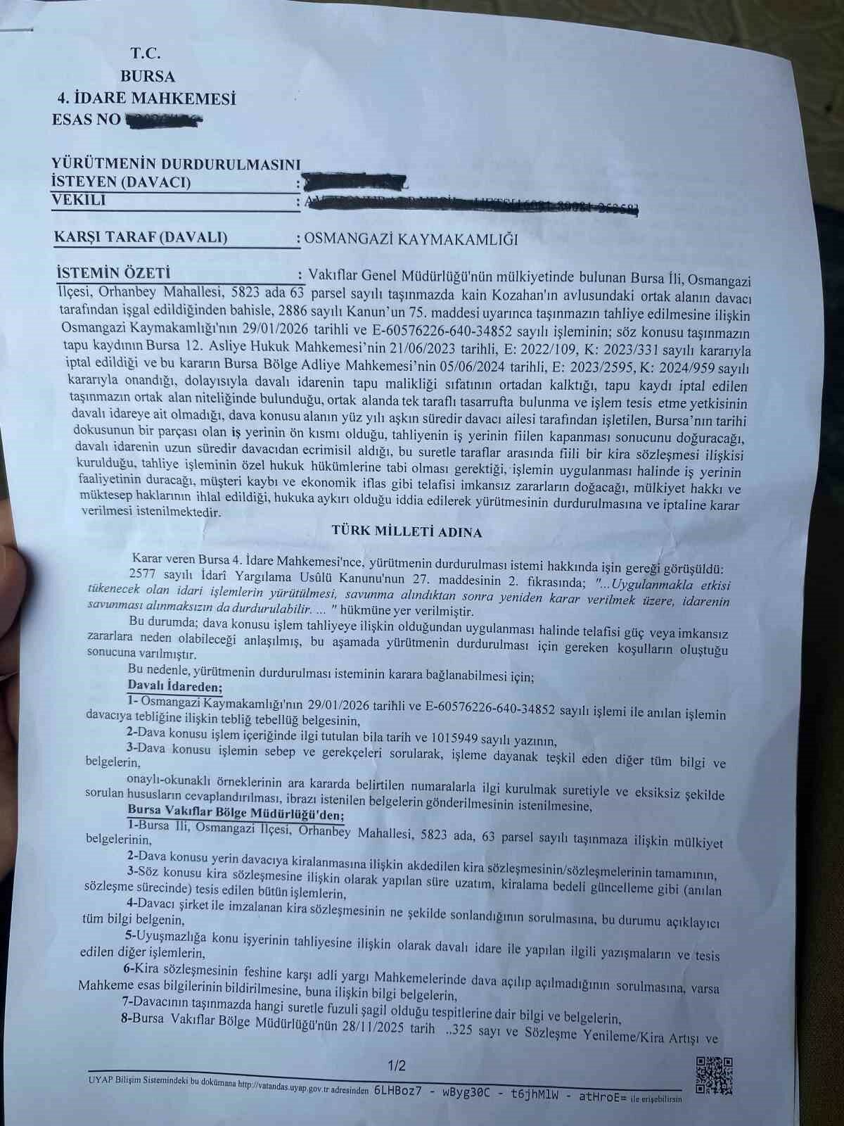 Yargılama süreci kapsamında Bursa Vakıflar Bölge Müdürlüğü’nden, taşınmaza ilişkin mülkiyet belgeleri, kira sözleşmesi ve “fuzuli şagil” tespitine dair tüm evrakların gönderilmesi istendi. İdareye savunma için 10 günlük süre tanındı.