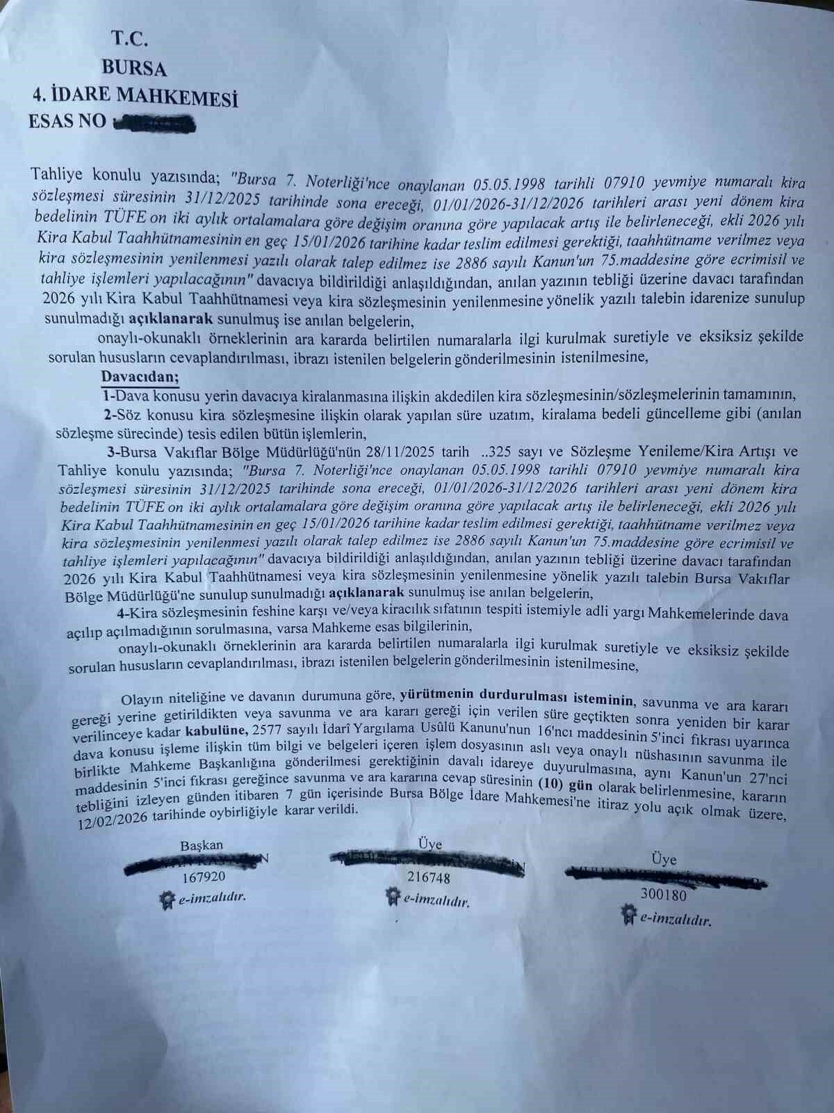 Yargılama süreci kapsamında Bursa Vakıflar Bölge Müdürlüğü’nden, taşınmaza ilişkin mülkiyet belgeleri, kira sözleşmesi ve “fuzuli şagil” tespitine dair tüm evrakların gönderilmesi istendi. İdareye savunma için 10 günlük süre tanındı.