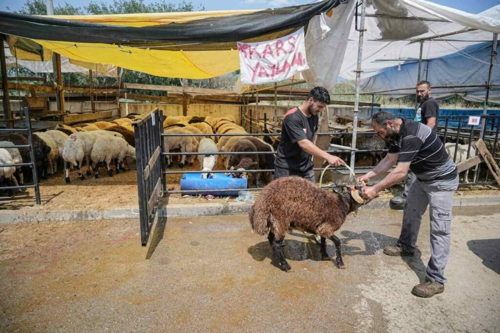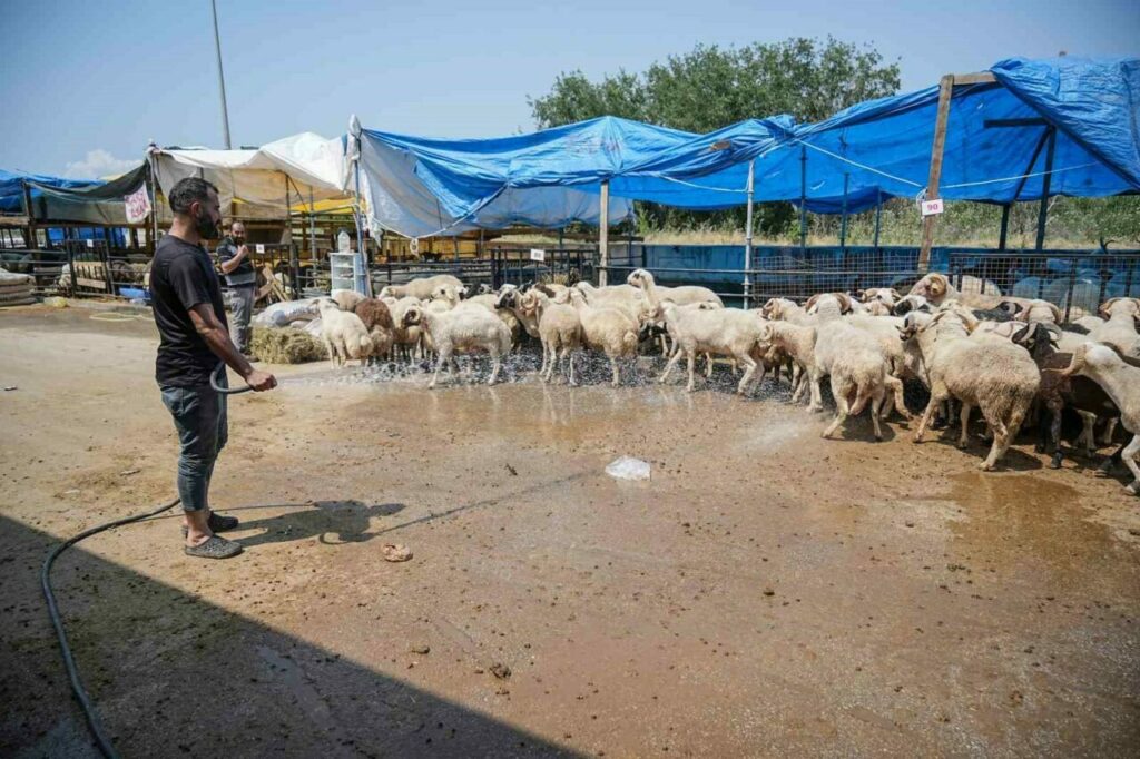 Öte yandan çadır altında bekleyen koçlar sıcak hava sebebiyle terlerken, yetiştiriciler ise hayvanların serinlemesi için farklı yöntemlere başvuruyor. Hayvan sahipleri, özellikle ayaklarda pişik ve sıcak çarpması riskine karşılık, kurbanlık koçların ayaklarına hortumla su tutarak serinletmeye çalışıyor.