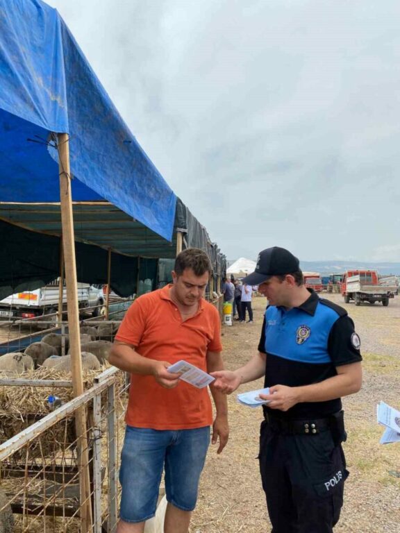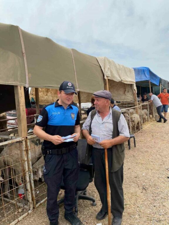 Karacabey Emniyet Müdürlüğü Asayiş Büro Amirliği ekipleri, Kurban Bayramı öncesi hayvan satışı yapılan pazara giderek esnafla buluştu. Polisler, satışa çıkardıkları hayvanlarını pazarlarken dolandırılmamaları için uyarıldı. Hırsızlık, sahte para ve tırnakçılık yöntemiyle dolandırıcılık konularında uyarılarda bulunan ekipler, esnafa Türk lirasının güvenlik özelliklerinin yer aldığı broşürler dağıttı.