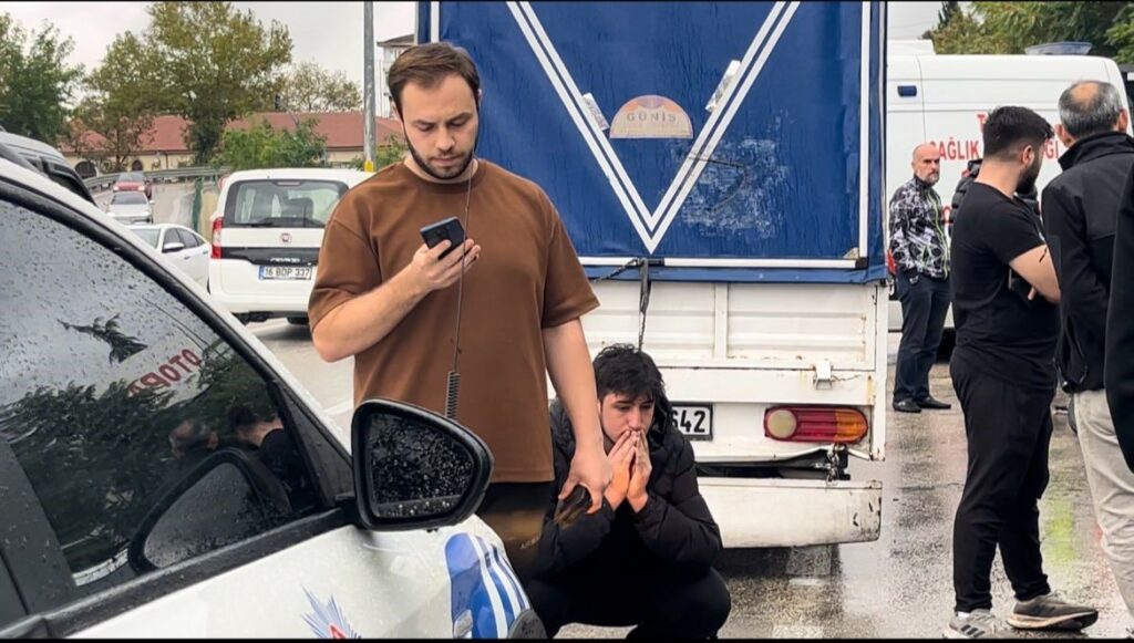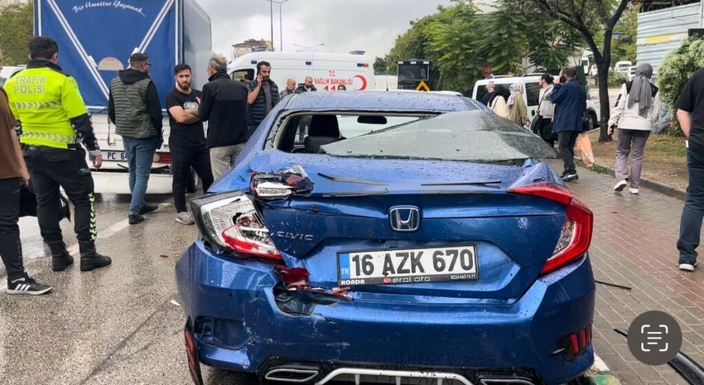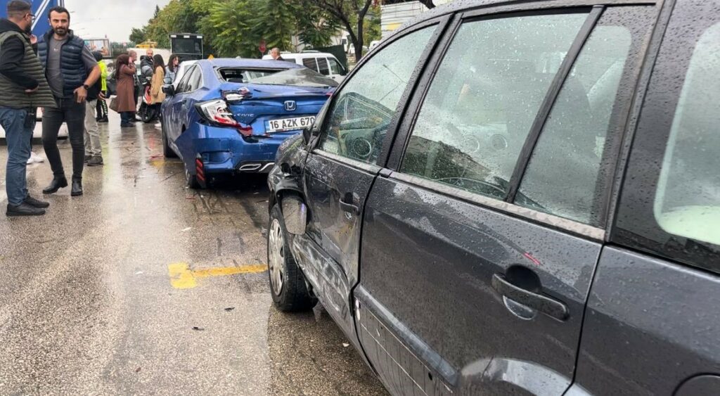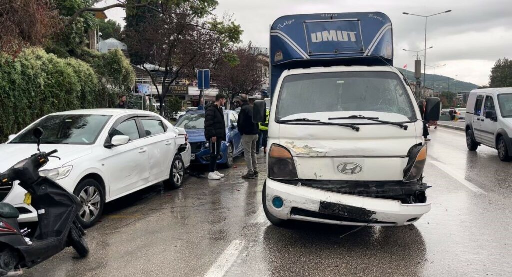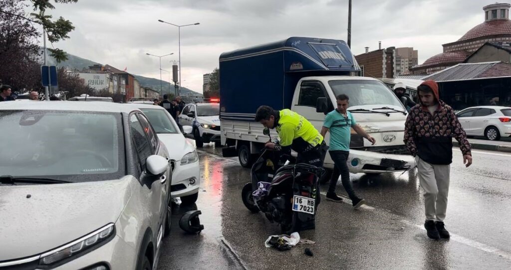 Merkez, Osmangazi ilçesi Elmasbahçeler Mahallesi Ali Ferruh Yücel Caddesi üzerinde 35 PC 642 plakalı kamyonetiyle seyir halinde olan Haktan E. (20) önünde ilerleyen Hişam M., idaresindeki 16 MB 7023 plakalı kurye motoruna çarpmamak için manevra yaptı. Yağmurlu havanın etkisiyle kontrolden çıkan kamyonet, park halindeki 4 araca çarpıp, kuryeye de çarptı. Kaza araçlar hurdaya dönerken, motosiklet ile sürüklenen kurye yaralandı. Çevredekilerin ihbarı üzerine olay yerine sağlık ekibi sevk edildi. Sağlık ekiplerince ilk müdahalesi yapılan yaralı Çekirge Devlet Hastanesine sevk edildi.