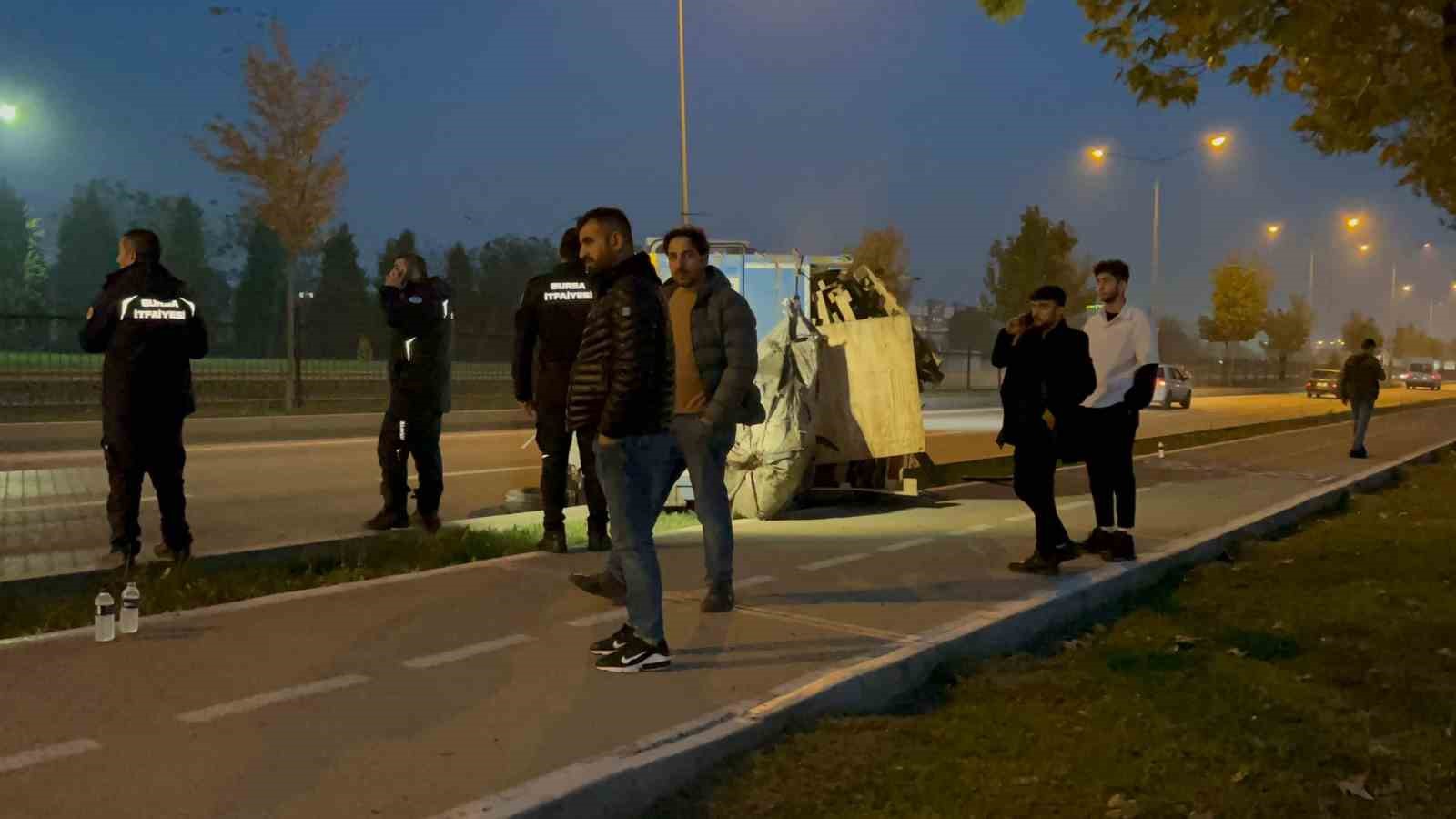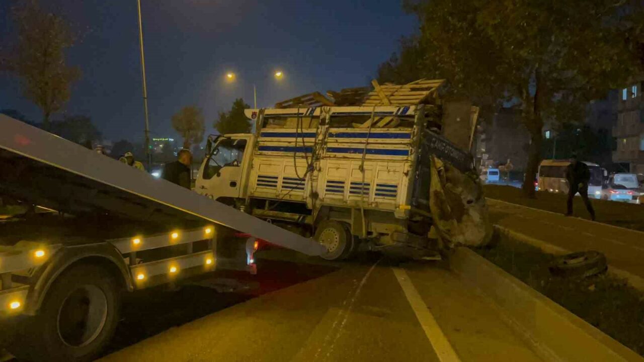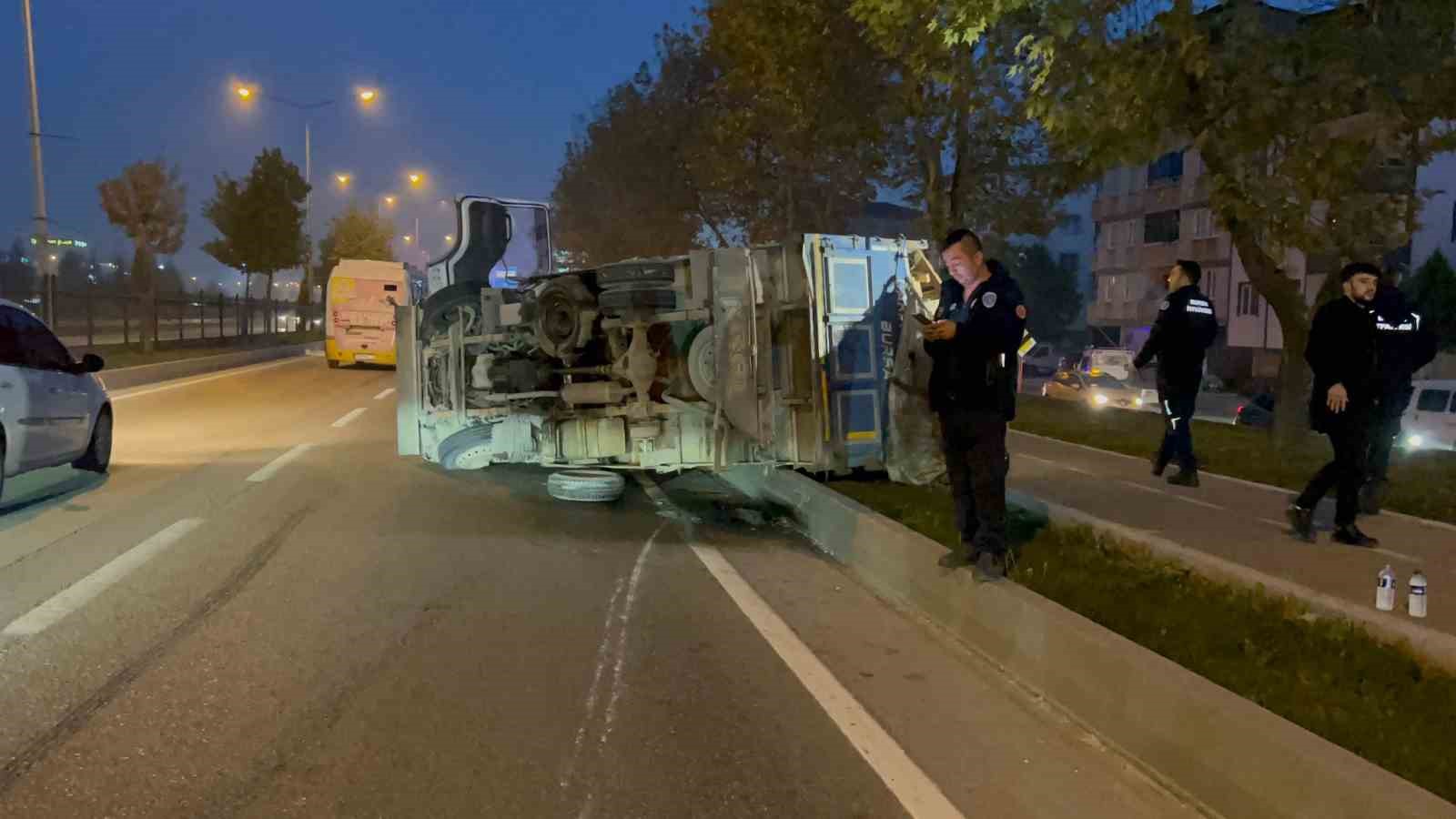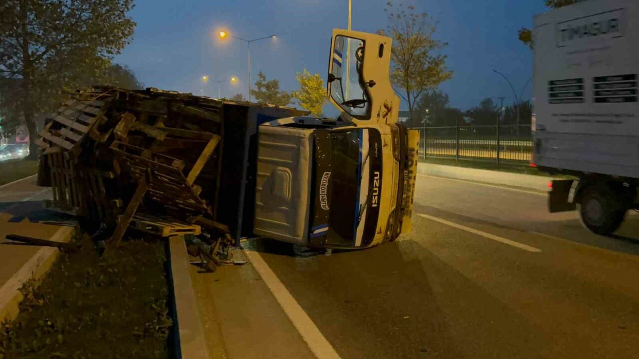 Bursa’nın İnegöl ilçesinde lastiği patlayan palet yüklü kamyonet devrildi, kazada şans eseri yaralanan olmadı.