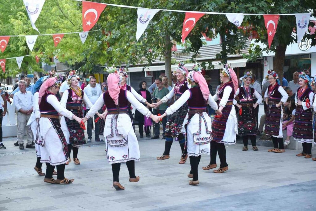 36’ncı Altın Karagöz Halk Dansları Yarışması’na katılan Letonya ve Kuzey Makedonya ekipleri Yenişehir’de Tarihi Belediye Binası önünde sahne aldı.