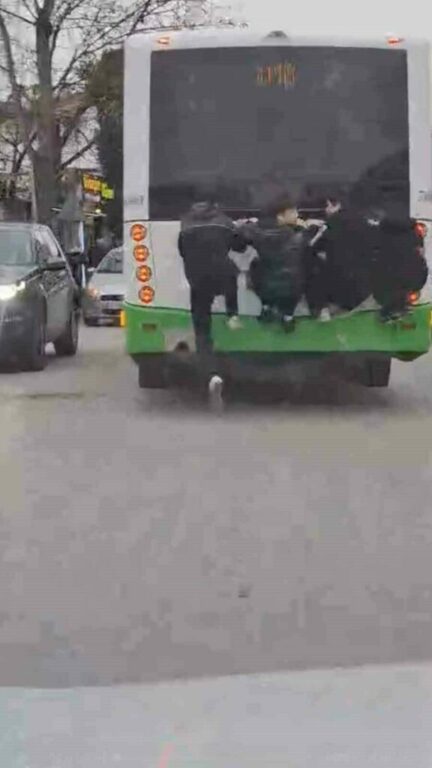 Edinilen bilgiye göre, Millet Mahallesi’nde özel halk otobüsünün arkasına asılan öğrenciler, trafikte ilerleyen otobüsün arasında yolculuk yaptı. Otobüs şoförünün durumdan haberdar olmadığı öğrenilirken, öğrencilerin bu davranışı gören vatandaşlar büyük panik yaşadı.