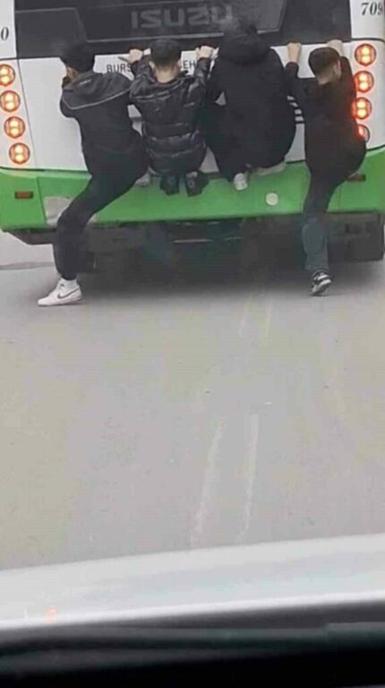 Bursa’nın Yıldırım ilçesinde seyir halindeki özel halk otobüsünün arkasına tutunan 4 lise öğrencisi, hem kendi canlarını hem de trafikteki diğer sürücüleri tehlikeye attı. Tehlikeli anlar, çevredeki bir vatandaşın cep telefonu kamerasına yansıdı.