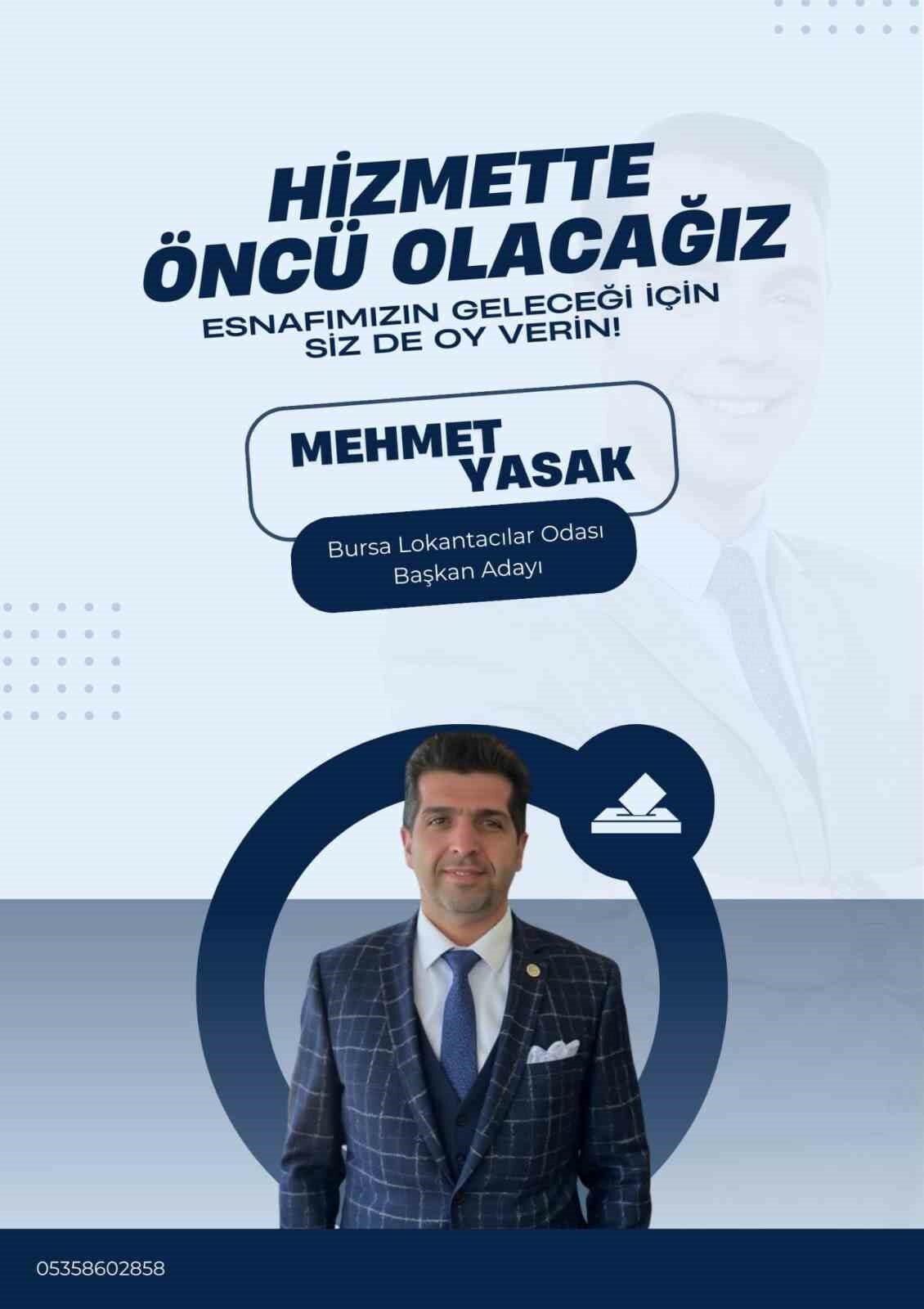 Bursa Lokantacılar, Kebapçılar, Köfteciler ve Benzeri Esnaf Odası’nda yaklaşan genel kurul öncesinde başkan adaylarından Mehmet Yasak, yönetim anlayışını ve projelerini kamuoyuyla paylaştı. 57 yıllık başkan Arif Tak’ın karşısında 4 aday yarışacak.