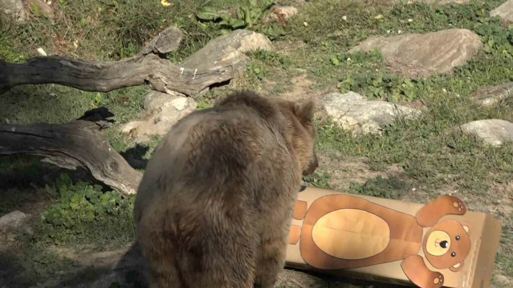 Bulundukları yerden alana gelen ayılar, ilk önce makete anlam veremedi. Temkinli yaklaşan ayılar, balığın kokusuna yaklaştıkça hızlarını arttırdı. Karton kutudan yapılan ayı maketini bir hamlede yerle bir eden ayılar, içine gizlenmiş balık, sebze ve meyveleri ise afiyetle midelerine indirdi.