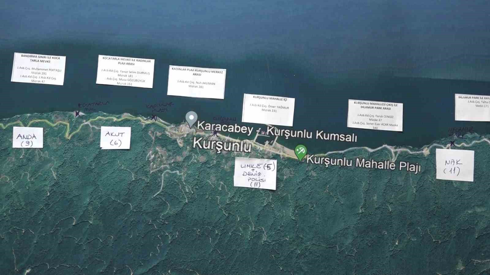 Bursa’nın Karacabey ilçesine bağlı Kurşunlu Mahallesi’nde AFAD, NAK, jandarma, polis dalgıç ve AKUT ekipleri arama-kurtarma çalışmalarına devam ediyor. Polis dalgıçları dürbünle dev dalgaların bulunduğu denizi tarıyor. Kurulan kriz merkezinde ekiplerin yerleri çıkarılan haritada belirlenerek, karış karış kurtarma çalışmaları planlanıyor. Sahil Güvenlik Komutanlığı’na bağlı arama-kurtarma uçağı ise denizin üzerinde çalışmalarını sürdürüyor. Kurşunlu Mahallesi’nde yaşayan vatandaşlar da arama-kurtarma çalışmalarına destek veriyor.