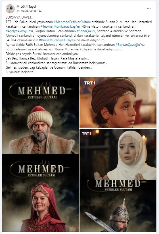Tarihi olayların canlandırıldığı diziler, toplumun her kesiminden ilgi görüyor. TRT 1’de yayınlanmaya başladığı günden bu yana ilgiyle izlenen ’Mehmed: Fetihler Sultanı’ dizisi ile birlikte Bursa Muradiye Külliyesi’ndeki Sultan Türbelerine ziyaretçilerin ilgisi arttı. Bursa Muradiye Camii İmamı Lütfi Taşçı dizinin oyuncularını sosyal medya hesabından Külliyeyi ziyarette davet etti.