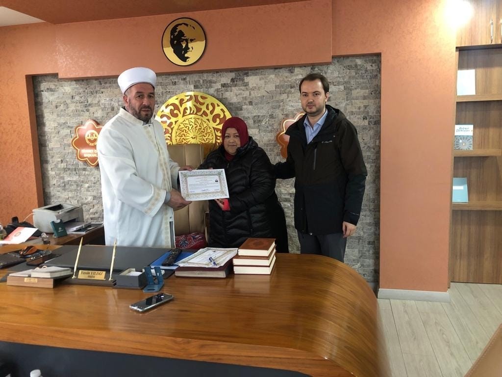 Meksikalı Edith Marin Bartolo için Orhangazi Müftülüğünde “İhtida Merasimi” düzenlendi. Orhangazi Müftüsü Yasin Yıldız rehberliğinde Kelime-i Şehadet getirerek Müslümanlığı seçen Bartolo’ya İlçe Müftüsü Yasin Yıldız tarafından İhtida belgesi ile Kuran-ı Kerim hediye edildi.
