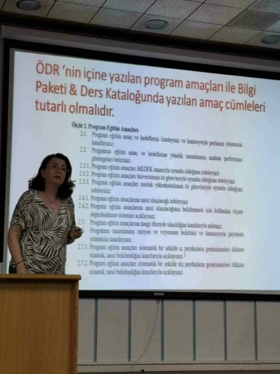 Seminerde ele alınan konular arasında Bilgi Paketi & Ders Kataloğundaki ilgili kısımların nasıl doldurulacağı, program yeterliliklerinin nasıl yazılması gerektiği ve AKTS (Avrupa Kredi Transfer Sistemi) hesaplamasının incelikleri yer aldı. Ayrıca, Akademik Yeterlilikler Çerçevesi (AYÇ), Türkiye Akademik Yeterlilikler Çerçevesi (TAYÇ) ve Türkiye Yükseköğretim Yeterlilikler Çerçevesi (TYYÇ) arasındaki ilişki de detaylandırıldı.