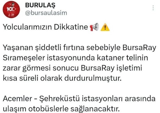 “Yaşanan şiddetli fırtına sebebiyle BursaRay Sırameşeler istasyonunda kataner telinin zarar görmesi sonucu BursaRay işletimi kısa süreli olarak durdurulmuştur. Acemler – Şehreküstü istasyonları arasında ulaşım otobüslerle sağlanacaktır.”