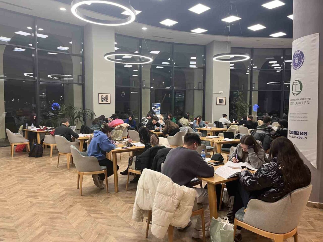 Bünyesindeki 8 kütüphanede, 111 bin basılı kaynak ve 26.529 dijital yayınla Bursalıları buluşturan Büyükşehir Belediyesi, Altıparmak’taki Millet Kütüphanesinin kapılarını 24 saat boyunca kitap kurtları ve ders çalışmak isteyen öğrencilere açtı.
