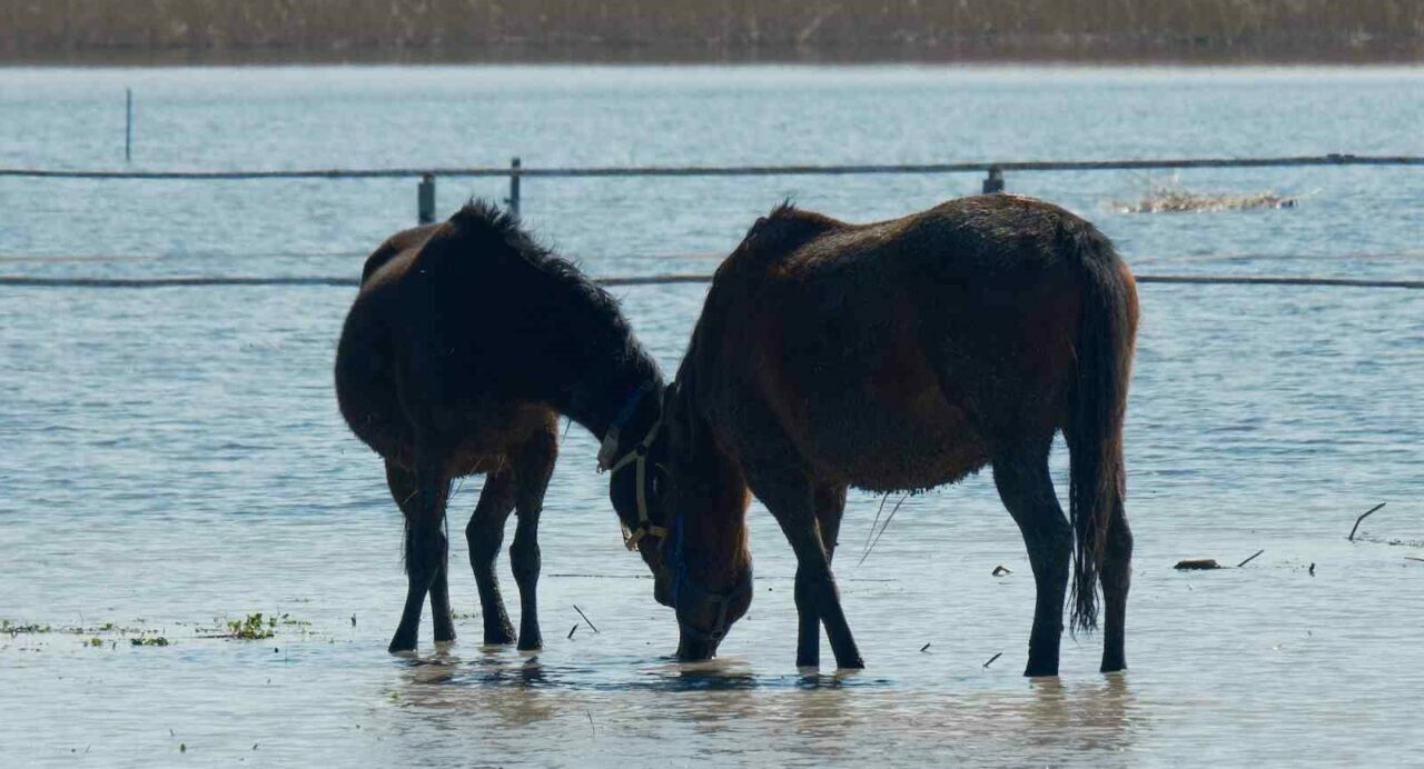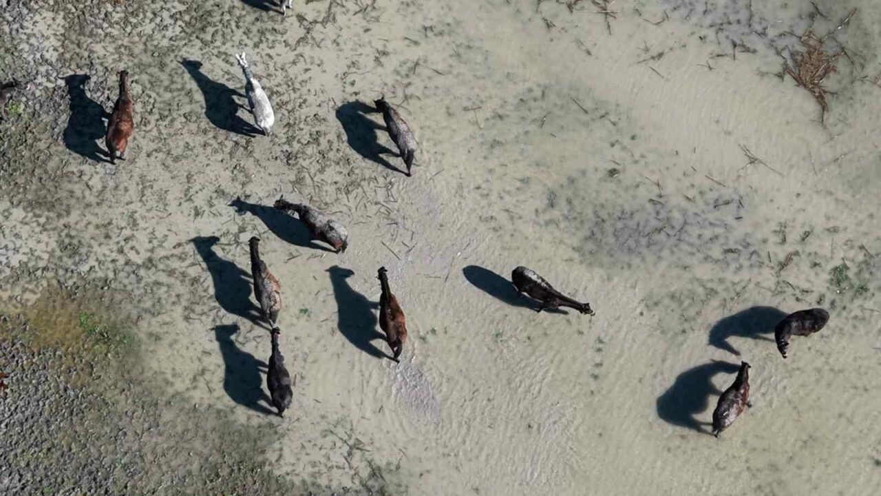 Bursa’nın Karacabey ilçesindeki Uluabat Gölü’ne yakın milyonluk yarış atlarının bulunduğu tavlalar su altında kaldı. Atlar, su içinde gezinirken drone ile görüntülendi.