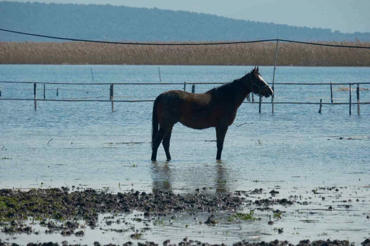 Uluabat Gölü, Bursa-İzmir kara yolunun kıyısına kadar gelirken bölgede bulunan milyonluk yarış atlarının bulunduğu tarlalar da su altında kaldı. Arap ve İngiliz yarış atları, su içinde gezinirken drone ile görüntülendi. Milyonluk tayların annesi olan damızlık atların büyük kısmının gebe olması da dikkat çekti.