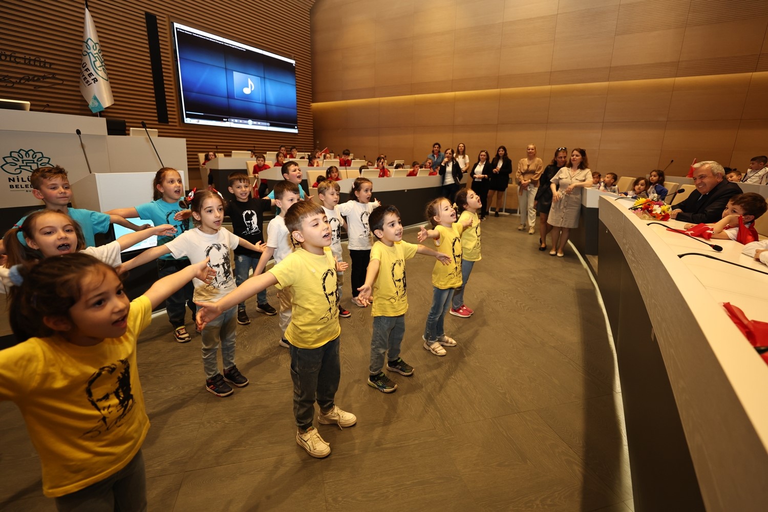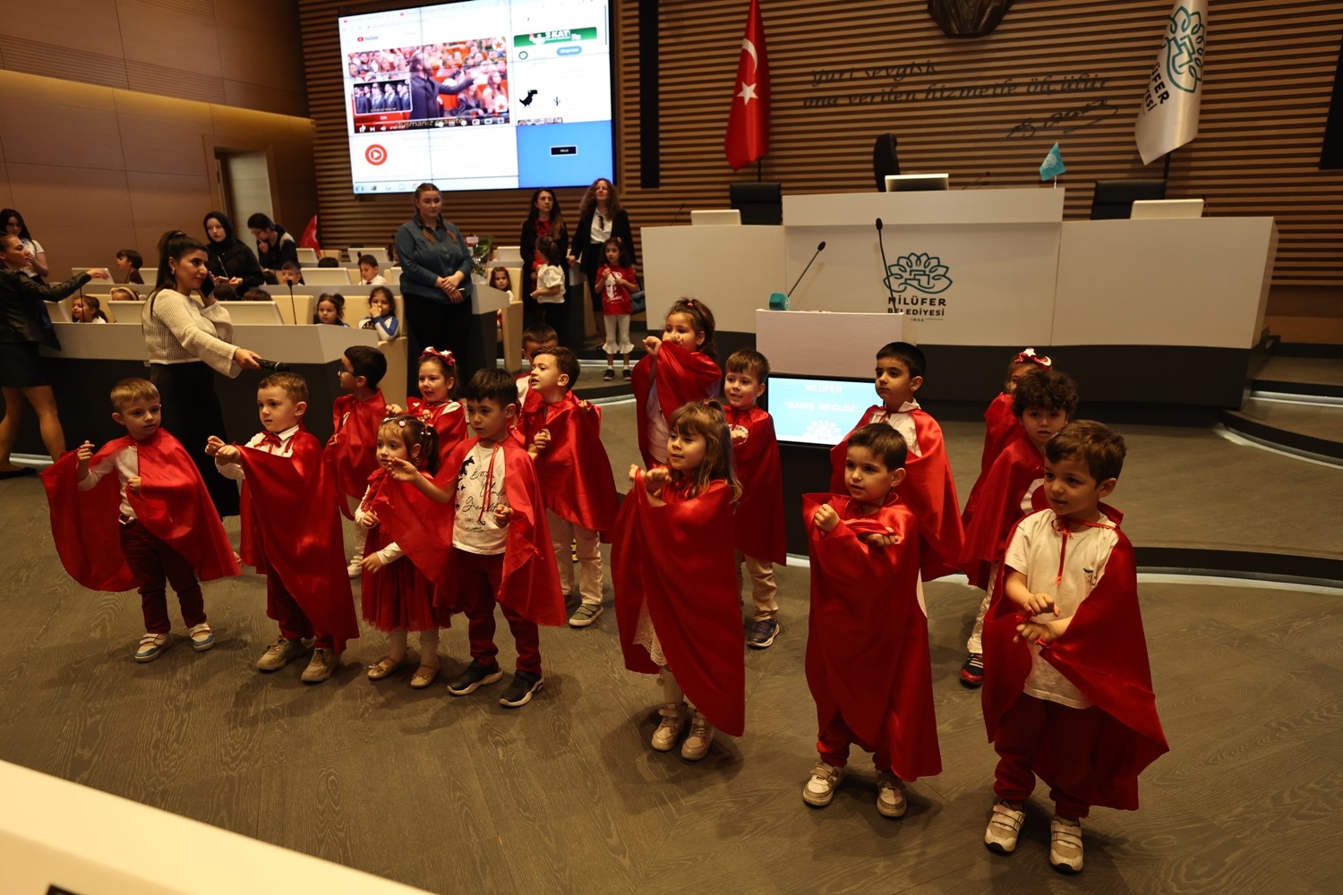 Nilüfer’deki anaokulları öğrencileri, 23 Nisan Ulusal Egemenlik ve Çocuk Bayramıkapsamında ziyaret ettikleri Halk Evi’ni bayram yerine çevirdi. Nilüfer’deki farklı okullardan yaklaşık 146 öğrenci Nilüfer Belediye Başkanı Şadi Özdemir ile Halk Evi’ndeki Barış Meclisi Salonu’nda buluştu. Nilüfer’de bulunan Emine Örnek, Görükle Çocuk Akademisi, Özel Efe Sarp, Canaydın, Özel Yiğitalp ve Özel Ege Berk anaokullarından gelen öğrenciler, okudukları şiirler, seslendirdikleri şarkılar ve sergiledikleri gösterilerle bayram coşkusu yaşattı. Miniklerin ellerinde Türk bayraklarıyla yaşadıkları coşkuya Başkan Şadi Özdemir de ortak oldu.