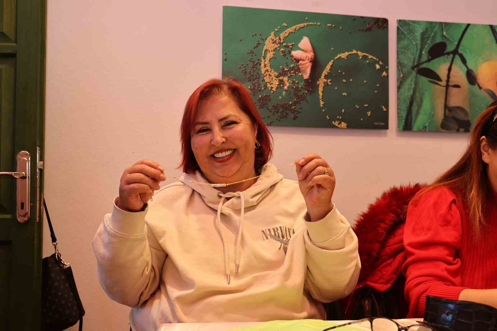 Kursiyerler, eğitmen Vildan Salihçavuş rehberliğinde miyuki boncuklardan bileklik, kolye ve küpe gibi takılar yaparak, hünerlerini sergiledi.