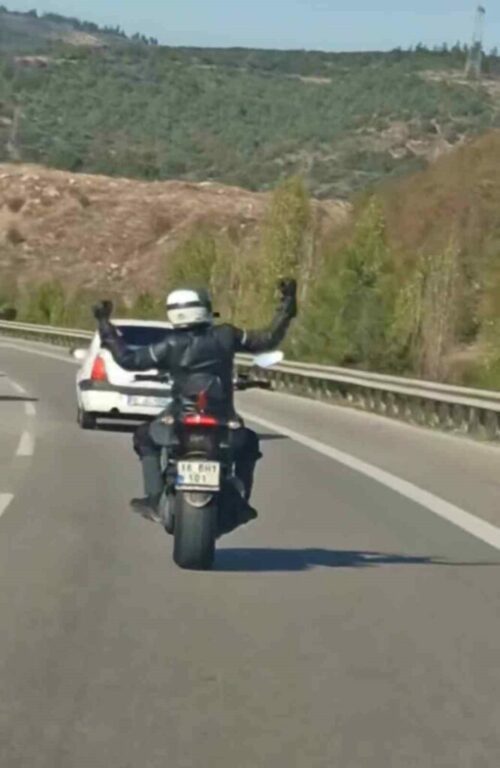 Bursa’da bir motosiklet sürücüsü seyir halindeyken, iki tekerlekli araç üzerinde dans etti. Bununla da yetinmeyen sürücü, trafik kurallarını da ihlal edip ölümüne sollama yaptı. O anlar kameraya yansıdı.