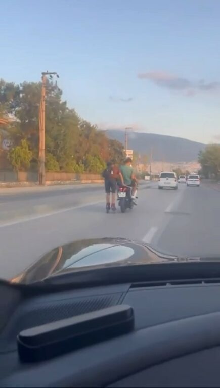 Merkez Osmangazi ilçesi Demirtaş Yolu Caddesi üzerinde seyir halinde olan patenli genç, yorulunca kimliği henüz tespit edilemeyen 16 MC 2790 plakalı motosiklete tutunarak seyahat etti. Kendi canını hiçe sayan paten sürücüsü amatör kameraya yansırken, motosiklet sürücüsünün artçısında da kask olmadığı görüldü.