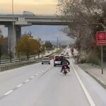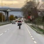 Bursa’nın Osmangazi ilçesi Ovakça mevkiinde meydana gelen olayda, kasksız motosiklet sürücüsü, motosikletiyle ilerlediği sırada yaptığı hareketlerle tehlikeye davetiye çıkardı. Yatarak kullandığı motosikletle adeta ölümle dans eden sürücünün tehlikeli yolculuğu cep telefonu kamerasıyla saniye saniye kaydedildi. Görüntülerde kasksız motosiklet sürücüsünün, iki teker üzerinde yatarak ilerlemesi yer alıyor.