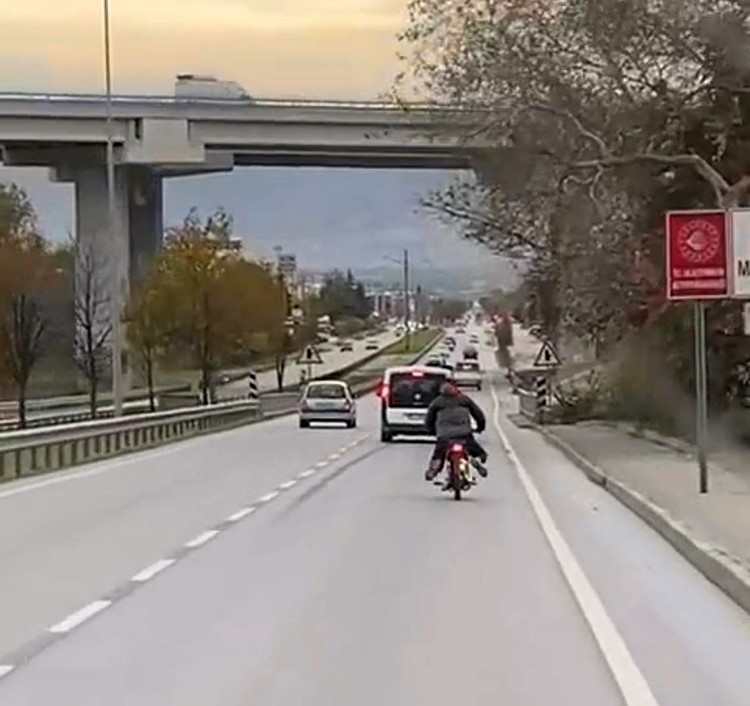 Bursa’da motosikletin üzerinde yatarak giden sürücünün tehlikeli yolculuğu, cep telefonu kamerası ile kaydedildi.