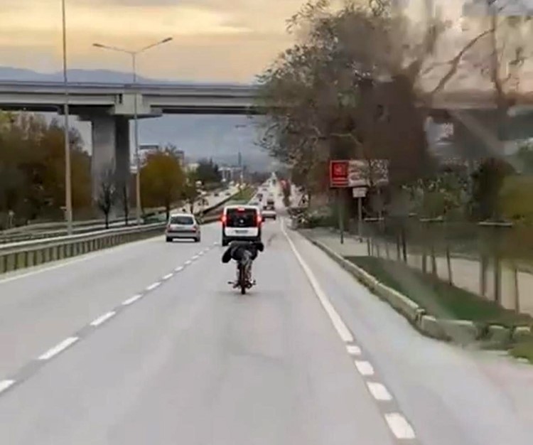 Bursa’nın Osmangazi ilçesi Ovakça mevkiinde meydana gelen olayda, kasksız motosiklet sürücüsü, motosikletiyle ilerlediği sırada yaptığı hareketlerle tehlikeye davetiye çıkardı. Yatarak kullandığı motosikletle adeta ölümle dans eden sürücünün tehlikeli yolculuğu cep telefonu kamerasıyla saniye saniye kaydedildi. Görüntülerde kasksız motosiklet sürücüsünün, iki teker üzerinde yatarak ilerlemesi yer alıyor.
