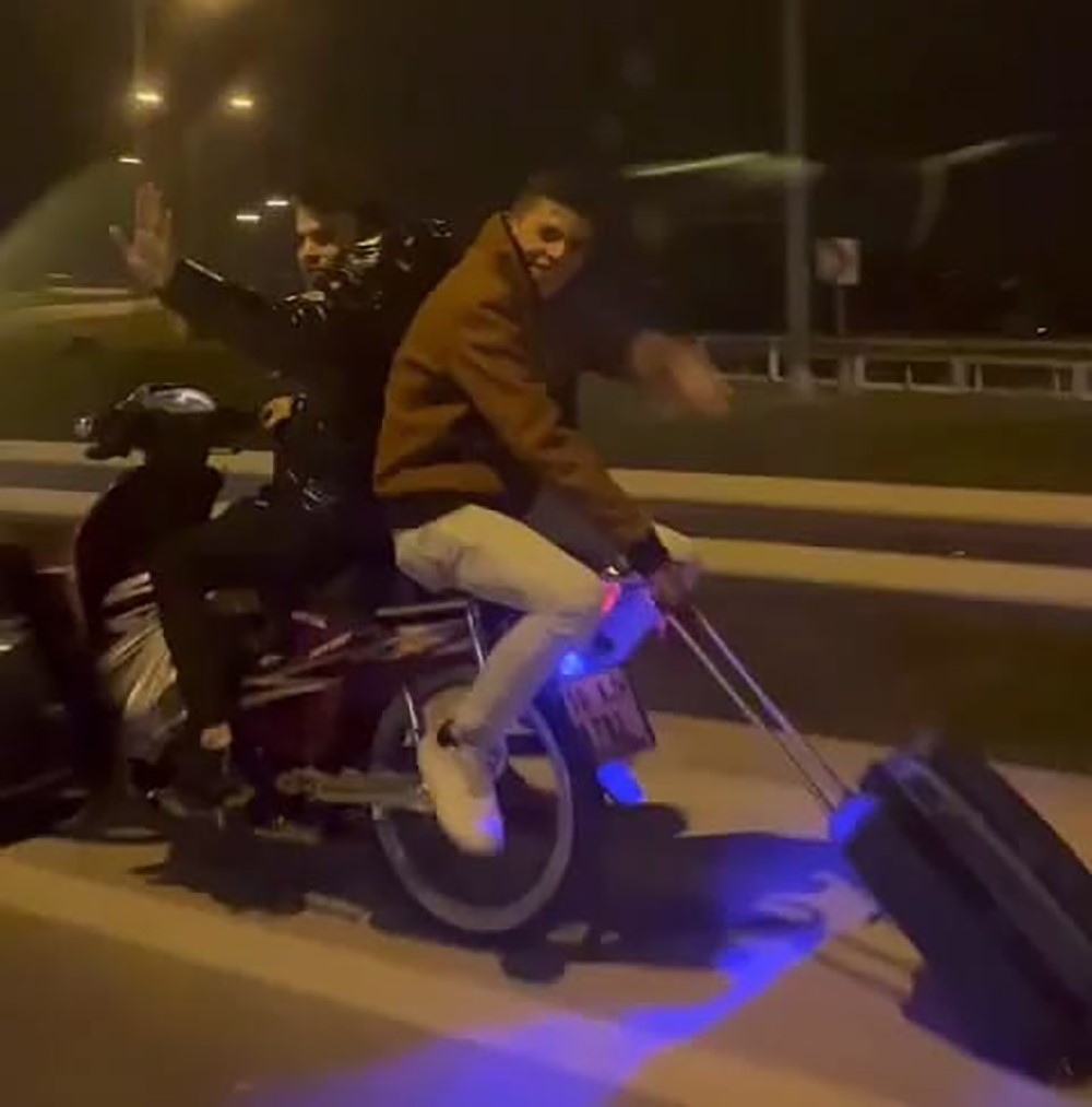 Olay, Bursa-Ankara karayolu İnegöl girişinde meydana geldi. Sürücü yönetimindeki motosikletin arkasına ters oturan genç, elindeki tekerlekli bavulu yol üzerinde sürükleyerek seyretti. Gençlerin tehlikeli yolculuğu ise başka bir sürücünün amatör kamerasına saniye saniye yansıdı.