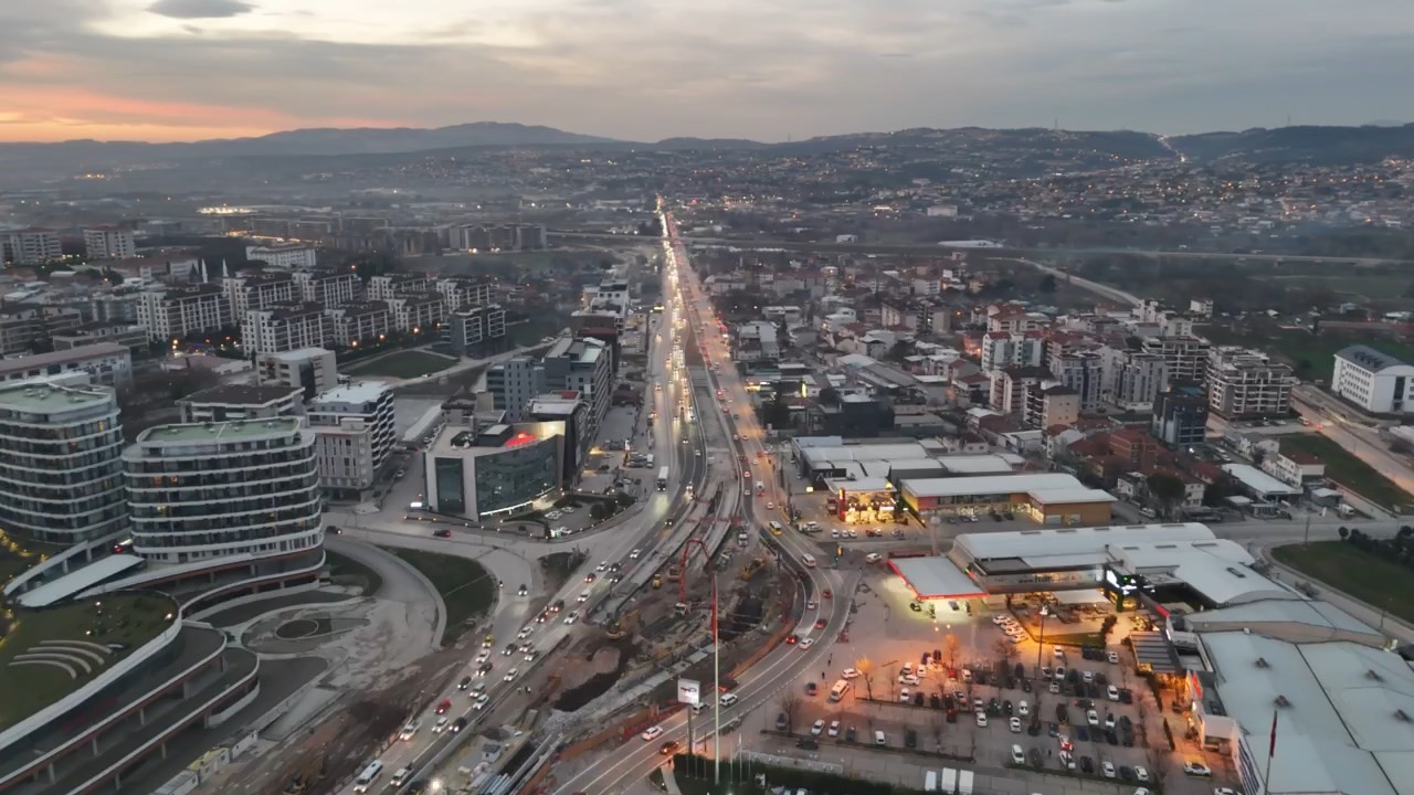 Bursa Büyükşehir Belediyesi tarafından projelendirilen Emek-Şehir Hastanesi Raylı Sistem Hattı çalışmalarının tamamlanmasıyla her iki yönde de 3’er şerit olarak normale dönen trafik, dron ile havadan görüntülendi. Çalışma sebebiyle uzun kuyruklar oluşan mevkide, trafiğin rahatladığı görüldü.