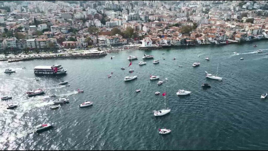 Cumhuriyet’in ilanının 100. yıl dönümü, tüm yurtta olduğu gibi Bursa’da da büyük coşkuyla kutlandı. Mudanya ilçesinde ise denizde onlarca vatandaş, tekneleriyle coşkuya ortak oldu. O anlar havadan görüntülendi.