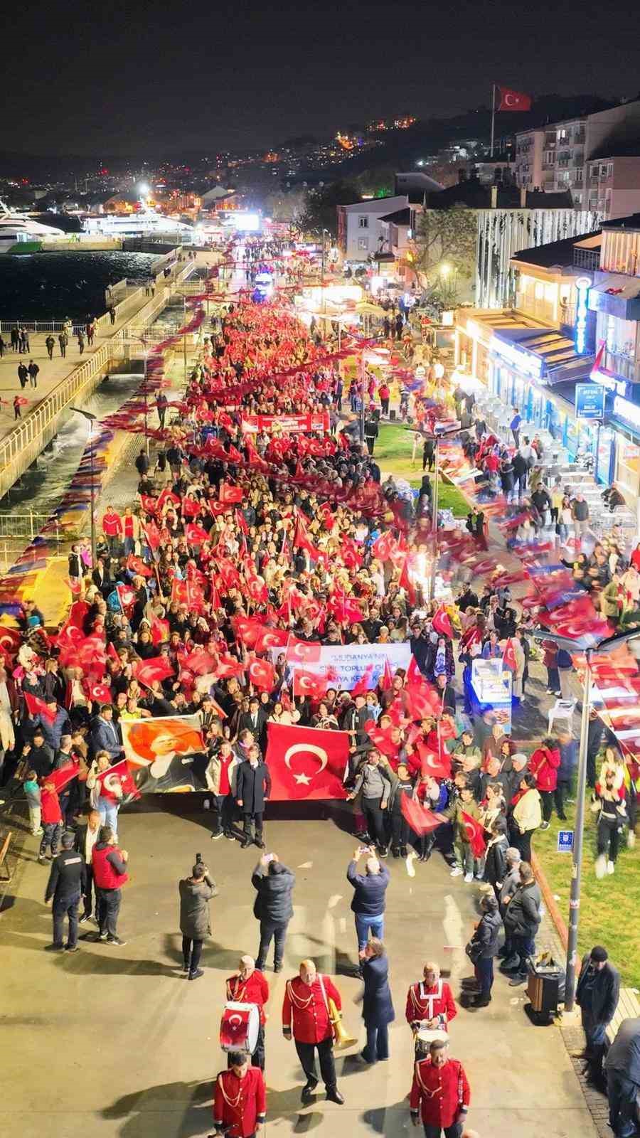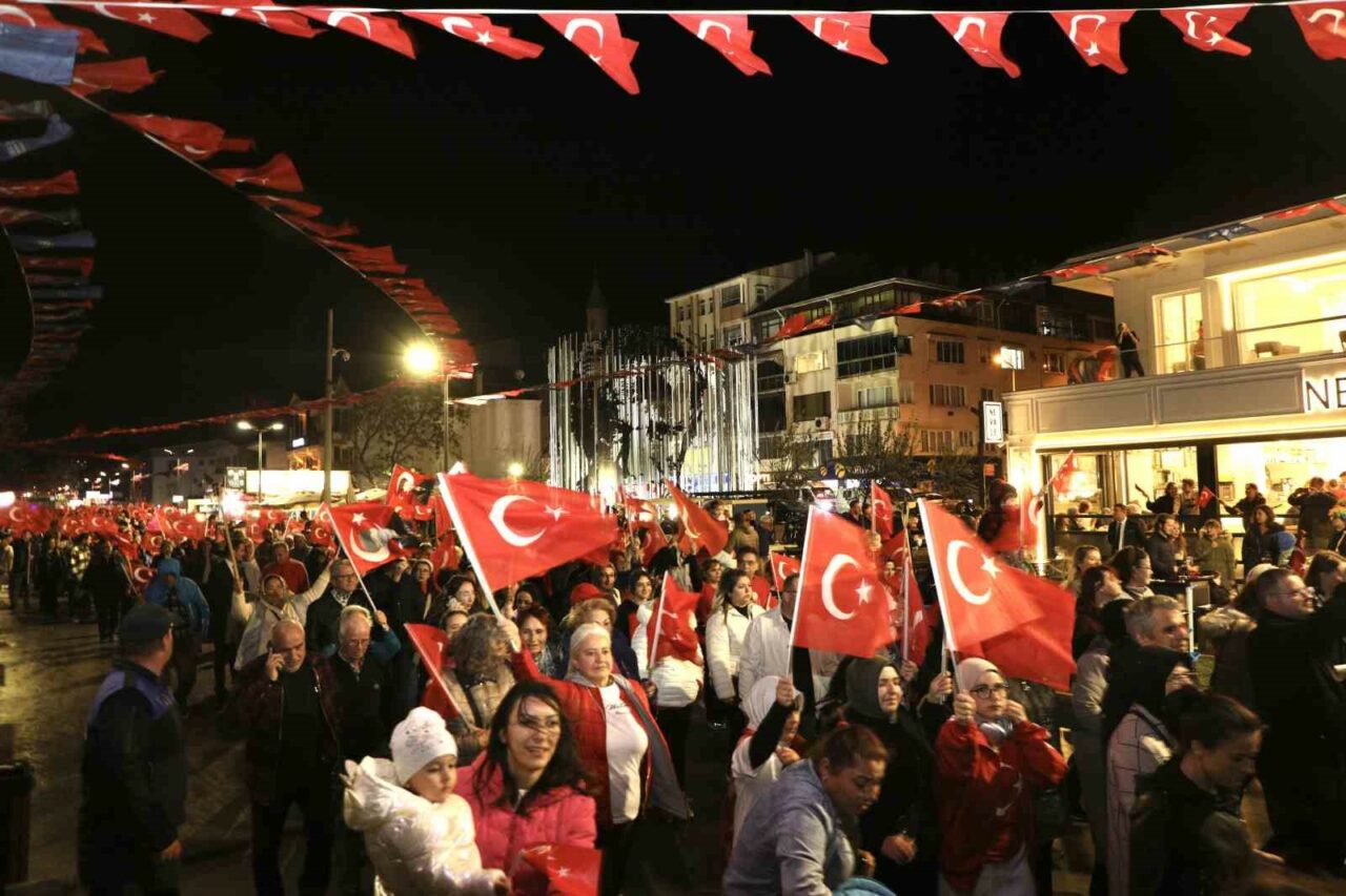 Mudanya’da 29 Ekim Cumhuriyet Bayramı coşkusu, denizde cumhuriyet tekneleri, sokaklarda vatandaşın coşkulu yürüyüşüyle doruğa ulaştı. Gündüz mavi sulara, akşam ise kırmızı beyaz renklere bürünen Mudanya, Cumhuriyet’in 101. yılını büyük bir coşkuyla kutladı.