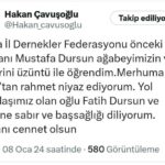 “Bursa İl Dernekler Federasyonu önceki başkanı Mustafa Dursun ağabeyimizin vefat haberini üzüntü ile öğrendim. Merhuma Allah’tan rahmet niyaz ediyorum. Yol arkadaşımız olan oğlu Fatih Dursun ve ailesine sabır ve başsağlığı diliyorum. Mekânı cennet olsun.”