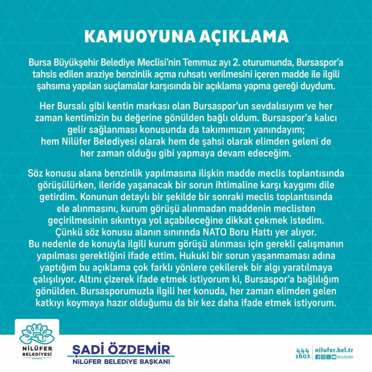 Nilüfer Belediye Başkanı Şadi Özdemir, şu açıklamayı yaptı: “Bursa Büyükşehir Belediye Meclisi‘nin Temmuz ayı 2. oturumunda, Bursaspor’a tahsis edilen araziye benzinlik açma ruhsatı verilmesini içeren madde ile ilgili şahsıma yapılan suçlamalar karşısında bir açıklama yapma gereği duydum. Her Bursalı gibi kentin markası olan Bursaspor’un sevdalısıyım ve her zaman kentimizin bu değerine gönülden bağlı oldum. Bursaspor’a kalıcı gelir sağlanması konusunda da takımımızın yanındayım; hem Nilüfer Belediyesi olarak hem de şahsi olarak elimden geleni de her zaman olduğu gibi yapmaya devam edeceğim.”