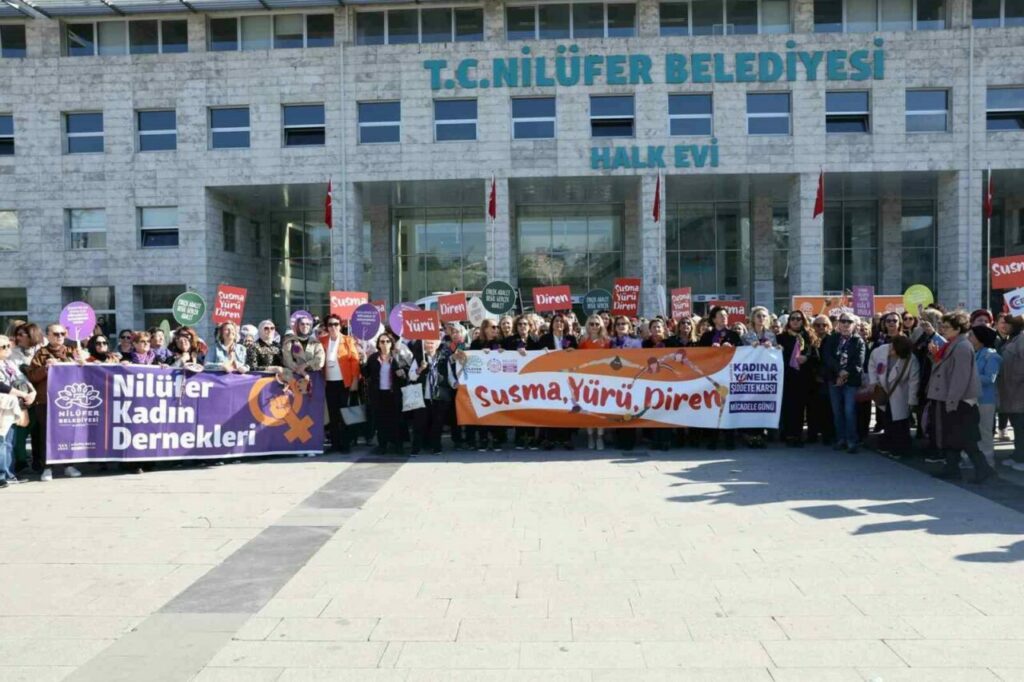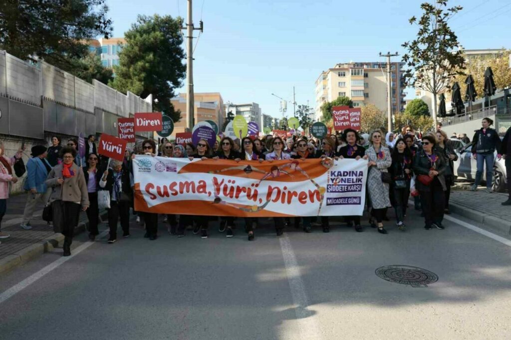 Nilüfer Belediyesi ve Nilüfer Kent Konseyi, 25 Kasım Kadına Yönelik Şiddete Karşı Uluslararası Mücadele Günü kapsamında düzenlediği yürüyüş ve söyleşi ile şiddete karşı farkındalık oluşturdu. Kadın cinayetlerine ve cezasızlık politikalarına dikkat çekilen etkinlikte, yerel yönetimlerin sorumlulukları ve çözüm önerileri masaya yatırıldı.