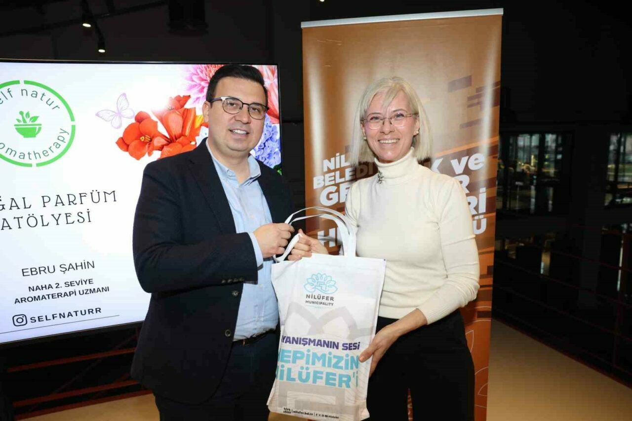 Nilüfer Belediyesi’nin düzenlediği “Aromaterapi Doğal Parfüm Atölyesi”nde katılımcılar, koku duyusunu