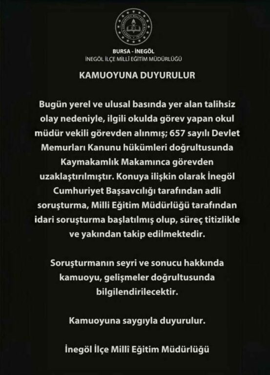 İlçe Milli Eğitim Müdürlüğünden yapılan yazılı açıklamada, “Bugün yerel ve ulusal basında yer alan talihsiz olay nedeniyle ilgili okulda görev yapan okul müdür vekili görevden alınmış; 657 sayılı Devlet Memurları Kanunu hükümleri doğrultusunda kaymakamlık makamınca görevden uzaklaştırılmıştır. Konuya ilişkin olarak İnegöl Cumhuriyet Başsavcılığı tarafından adli soruşturma, Milli Eğitim Müdürlüğü tarafından idari soruşturma başlatılmış olup, süreç titizlikle ve yakından takip edilmektedir. Soruşturmanın seyri ve sonucu hakkında kamuoyu, gelişmeler doğrultusunda bilgilendirilecektir” denildi.