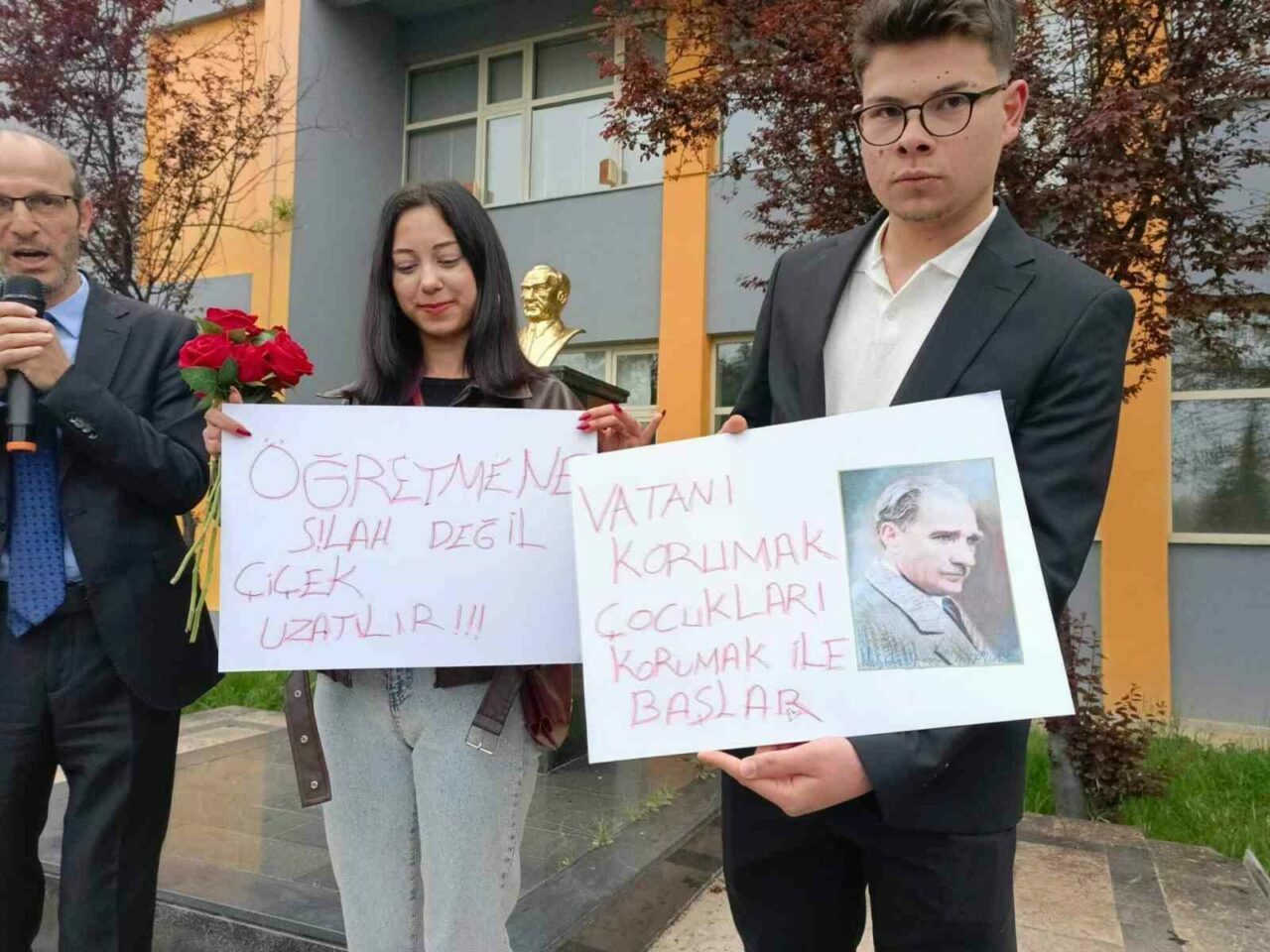 Öğrenciler, ‘öğretmene silah değil, çiçek uzatılır’ ve ‘Vatanı korumak çocukları korumaktan başlar’ pankartlarıyla arkadaşlarını karışlayan öğrenciler, ayrıca tüm öğretmen ve öğrencilere karanfil dağıttı. Öğrencilerinin bu duyarlılığının kendilerini çok duygulandırdığını ifade eden Şehit Erol Olçok Turizm Mesleki ve Teknik Anadolu Lisesi Müdür Yardımcısı Mehmet Niyazi Köse, “Eğitimci olarak bizler on iki günde meslek hayatlarının en zor dönemini yaşadık. Bu süreç öğrencilerimiz için çok daha zordu. Ancak onlar kendi zorluklarını unutarak arkadaşlarına ve bizlere büyük bir sürpriz yaptı. Kendileri küçük de olsa kalplerinin ne kadar büyük olduğunu bize gösterdiler. Bizim tahayyül ettiğimiz Türk Gençliği işte tam olarak budur. Öğrencilerimiz kutluyor ve onların öğretmenleri olmaktan gurur duyuyoruz” dedi.