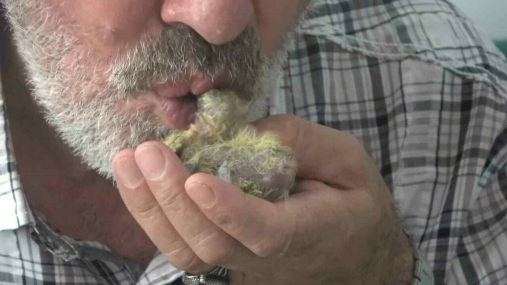 Yozgat’tan Bursa’daki oğlu ve gelinin evine misafir olarak gelen 62 yaşındaki Yusuf Ovalı, evin arkasında bulduğu ölmek üzere olan yavru güvercini eve aldı. Ağzında ekmek çiğneyerek besleyen baygın haldeki kuşu su da içirerek canlandırdı. Misafirliği süresince pamuklara sararak beslediği kuşu her gün ağzıyla besleyen Ovalı, yavru kuşun kendisini annesi sandığını ve sesini duyunca ötmeye başladığını söyledi.