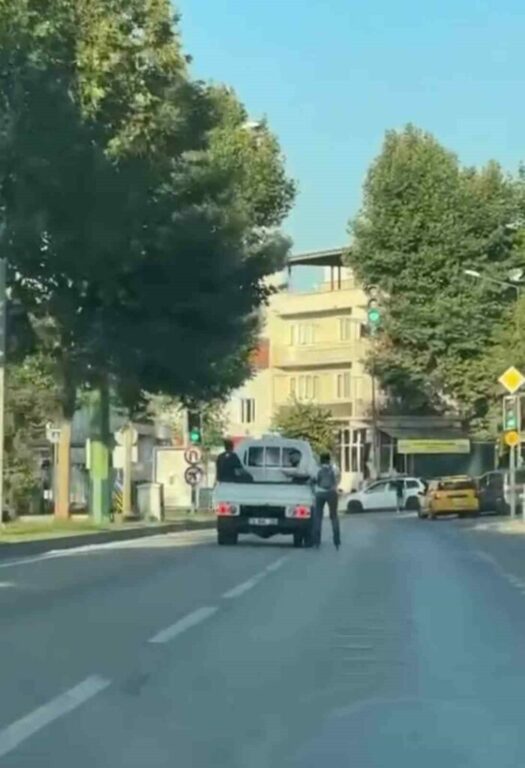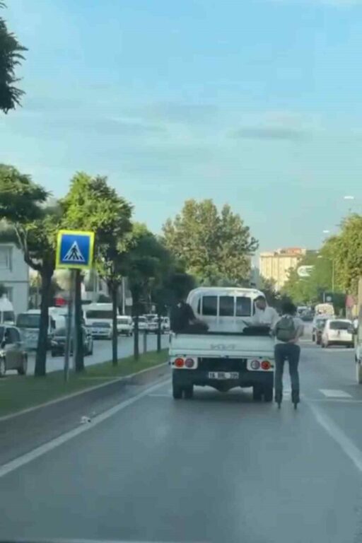 Bursa’da kırmızı ışıkta duran kamyonetin kasasına tutunan bir kişi, akan trafikte paten kayarak yolculuk yaptı. Canlarını tehlikeye atan genç kameraya yansırken, kamyonetin kasasında ise oturan iki kişi dikkat çekti.