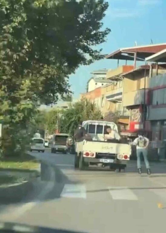 Bursa’nın Yıldırım ilçesinde trafiğin en yoğun seyrettiği caddelerden biri olan Eğitim Caddesi üzerinde tehlikeli yolculuk yürekleri ağza getirdi. Seyir halindeki açık kasa kamyonete tutunarak paten kayan genç hem trafiği tehlikeye düşürdü, hem de kendi canını hiçe saydı. Hareket halindeki açık kasa kamyonete tutunan patenli gencin tehlikeli şekildeki yolculuğu cep kamerasına yansırken, kamyonetin arkasında bulunan iki kişi de dikkatlerden kaçmadı.
