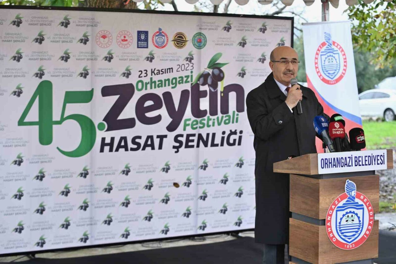 Açılış töreninde konuşan Bursa Valisi Mahmut Demirtaş yapılacak hasadın bereketli olmasını diledi. Zeytin söz konusu olduğunda akıllara gelen ilk şehrin Bursa olduğunu dile getiren Vali Demitaş, “Bugün ülkemizde yaklaşık 940 bin ton civarında zeytin üretimi yapılıyor. Bu üretimin hemen hemen 190 bin tonu Bursa’da gerçekleşiyor. 2022 yılı verilerine göre 190 bin tonun, 49 bin tonu Orhangazi’de üretiliyor. Bu sene hava şartları sebebiyle rekolte düşük olsa da kalitede ve fiyatlarda ciddi bir artış var. Büyükşehir Belediyesi, ilçe belediye başkanlarımız ve Tarım İl Müdürlüğü’nün de çiftçilerimize ciddi destekleri var. Bu yıl sadece devletimizin Bursa’daki zeytin üreticilerimize yapmış olduğu katkı yaklaşık 22 milyon TL civarında. İnşallah bu destekler de devam edecek” diye konuştu.