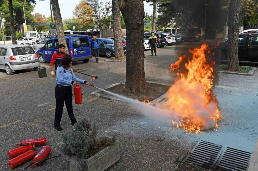 Binaların yangından korunması hakkındaki yönetmelik kapsamında belediye çalışanlarına yönelik düzenlenen eğitimde, yangınları önlemek için alınması gereken tedbirler ve özellikle kapalı alanlarda yangın ile karşılaşıldığında yapılması gerekenler anlatıldı. Bu kapsamda Osmangazi Belediyesi Sivil Savunma Ekipleri Zabıta Müdürlüğü’nde yangın tatbikatı düzenledi. Kontrollü bir şekilde yakılan ateş yangın tüpleri kullanılarak personel tarafından sırayla söndürüldü.