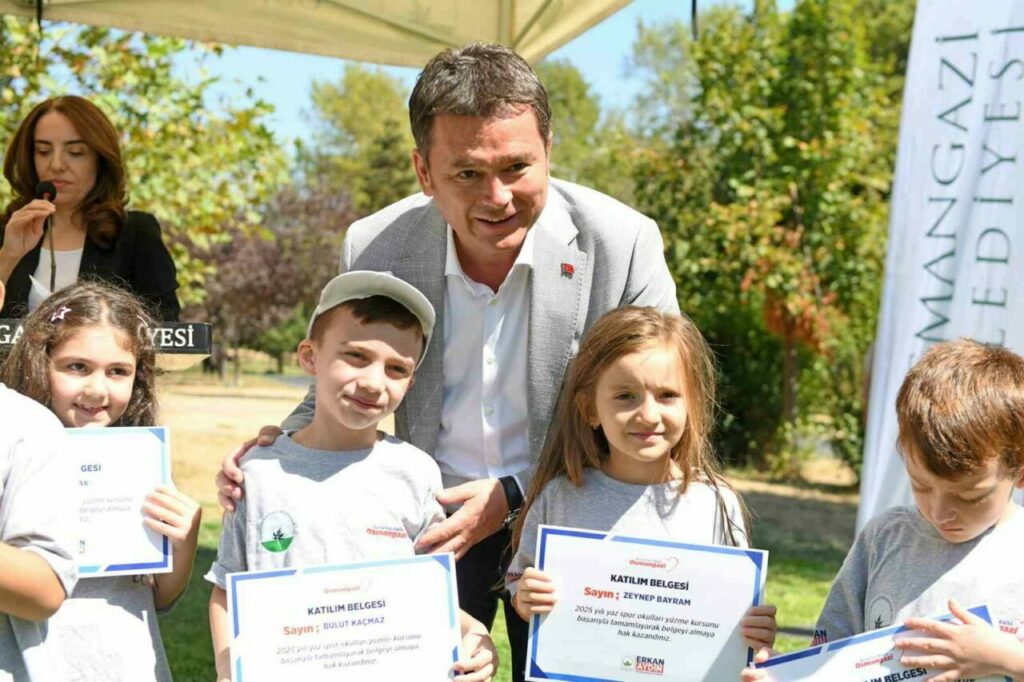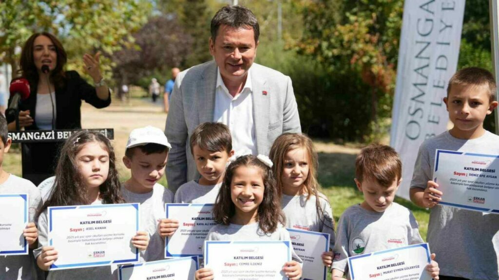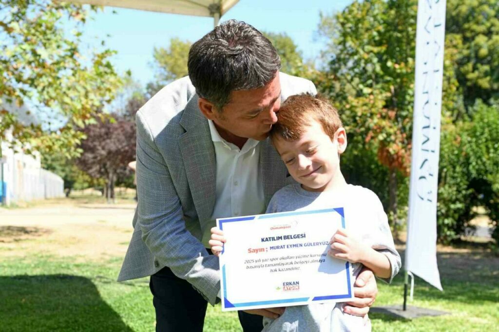 Osmangazi Belediyesi’nin yaz spor okulları kapsamında düzenlediği yüzme kursları büyük ilgi gördü. Sertifikalarını Başkan Erkan Aydın’ın elinden alan minikler, büyük mutluluk yaşadı.